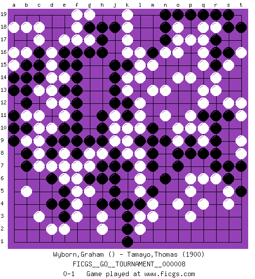 Last move : 0-1 2007 February 22 13:57:12 [Event "FICGS__GO__TOURNAMENT__000008"] [Site "FICGS"] [Date "2006.08.12"] [Round "1"] [Black "Wyborn,Graham"] [White "Tamayo,Thomas"] [Result "0-1"] [Rating 2 "1900"] 1.r16 e17 2.p4 p17 3.d4 q6 4.k3 q4 5.p16 o16 6.p15 q17 7.r17 k17 8.c16 d15 9.c15 d14 10.c14 d13 11.r8 r13 12.r11 p3 13.o15 n16 14.h16 q16 15.r15 q15 16.q14 r14 17.e16 d16 18.b12 c17 19.b17 q13 20.s6 f3 21.e3 f4 22.n15 p14 23.d6 m3 24.r19 r18 25.s18 q18 26.s19 s15 27.m16 m15 28.j15 l15 29.f15 h3 30.j13 g17 31.h17 c3 32.d9 e2 33.k12 c18 34.j4 b18 35.a17 s4 36.j6 b5 37.b10 a18 38.f13 c13 39.b13 b16 40.b15 a15 41.h7 e11 42.n14 q10 43.r10 m13 44.q11 n13 45.p8 o10 46.o7 o4 47.m7 p5 48.f10 c11 49.e10 f6 50.m9 l11 51.f11 e12 52.b7 k10 53.f12 p11 54.g18 f18 55.j18 k18 56.b14 c10 57.a14 a16 58.e15 b11 59.a11 b9 60.a10 a12 61.a13 k8 62.h9 j10 63.h11 g8 64.f9 h8 65.j8 j9 66.j7 g7 67.g9 l7 68.j5 l5 69.k7 l6 70.n6 m4 71.l4 l3 72.k4 l8 73.m8 d2 74.e4 f5 75.e5 c8 76.d8 c7 77.b8 c9 78.a9 d7 79.e7 e6 80.f8 f7 81.g6 g5 82.h6 q9 83.q8 s12 84.s16 t16 85.t18 q12 86.r9 t9 87.o8 o9 88.r7 t8 89.h10 l12 90.k11 l10 91.m10 n11 92.m5 p6 93.k2 h2 94.h4 l2 95.k1 k16 96.t7 r6 97.d11 d12 98.p9 p10 99.n9 t11 100.s11 t12 101.q19 o18 102.n17 o17 103.n18 e14 104.f14 j11 105.l9 k9 106.j12 s5 107.t5 g19 108.h18 d10 109.e13 k14 110.m14 l14 111.j14 k19 112.o19 k13 113.k15 o14 114.s7 e8 115.e9 e7 116.f16 f17 117.g16 l16 118.p19 f19 119.n19 pass 120.pass pass 0-1 Comment by player 1 : Graham Wyborn : OK, sorry missed that. Thanks again. Here are the names of the openings (joseki) played in the four corners : Corner q16 : r16 p17 Komoku (Somok, Xiao~mu`) 3-4 Point. The komoku (3-4) point is the traditional corner enclosure move.. Ikken Kakari (Hankan Keolch'im, Yi Gua`jiao~, 1-Space Low Pincer). The small knight move is the basic approach move to the 3-4 point stone. It has been continually used for over four centuries. There are limitless variations, with new moves constantly being discovered. White 2 opens the door to a treaure store of joseki. Corner q4 : p4 q6 Takamoku (Gomok, Gaomu`) 5-4 Point. The takamoku (high) point (5-4). With its emphasis on influence, the 5-4 point complements the 4-4 (hoshi) point in creating an influence-oriented fuseki. Corner d16 : e17 c16 Mokuhazushi (Waemok, Wai`mu`) 5-3 Point. The mokuhazushi (5-3) point was popular in the Edo period in Japan (1600 - 1867). It emphasizes influence; territorially, it is inferior to the 3-4 point. Komoku Kakari. Black 2 is the standard approach because of its solidity and stability. Corner d4 : d4 f3 Hoshi (Hwajeom, Seongjeom, Xingwei`) 4-4 Point. The star or hoshi (4-4) point, emphasizing influence at the potential expense of territory. Ikken Kakari (Hankan Keolch'im, Yi Gua`jiao~, 1-Space Low Approach). White 2 is the standard approach move to the 4-4. Player White won this Go (weiqi, baduk) game. Follow this game move after move (download)You don't have to be really good anymore to get good results. What's happening with chess is that it's gradually losing its place as the par excellence of intellectual activity. Smart people in search of a challenging board game might try a game called Go. (Hans Berliner, The New York Times, 2003) Locking firmely the window serves nothing, only small thiefs pass through there, the big thiefs enter through the front door. (Luc-Olivier Leclerc)