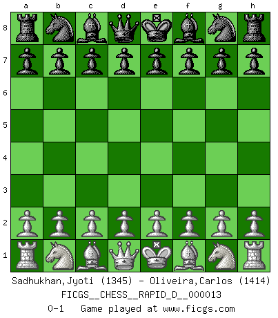 Last move : 0-1 2008 October 24 12:36:58 [Event "FICGS__CHESS__RAPID_D__000013"] [Site "FICGS"] [Date "2008.09.24"] [Round "1"] [White "Sadhukhan,Jyoti"] [Black "Oliveira,Carlos"] [Result "0-1"] [WhiteElo "1345"] [BlackElo "1414"] 0-1 This chess game has been lost on time (started : 2008.09.24 5:59:52) Player Black won this chess game. Follow this game move after move (download)I believe that Chess possesses a magic that is also a help in advanced age. A rheumatic knee is forgotten during a game of Chess and other events can seem quite unimportant in comparison with a catastrophe on the chessboard. (Vlastimil Hort) Je mehr wir mit Computern analysieren, desto mehr glauben wir an Verteidigung. (Vladimir Kramnik) El Rey es una pieza de pelea. ¡Usenlo!. (Wilhelm Steinitz) Les Echecs sont affaire de jugement sensible. Savoir quand frapper et quand esquiver. (Fischer) . 'gn is not allowed in chess unless n is an integer between 1 and 8 inclusive, where 1 and 8 are to interpreted as the standard numerals standing for integers in the ordered real-closed field R, with the *canonical* ordering. (As opposed to, say, an integer in the domain Z[2+i*sqrt(5)] or an integer in some exotic Grothendieck topos). (Normajean Yates)