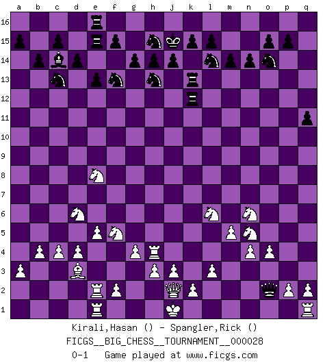 Last move : 0-1 2008 November 6 10:53:44 [Event "FICGS__BIG_CHESS__TOURNAMENT__000028"] [Site "FICGS"] [Date "2008.09.25"] [Round "1"] [White "Kirali,Hasan"] [Black "Spangler,Rick"] [Result "0-1"] [WhiteElo ""] [BlackElo ""] 1.e2-e4 g15-g14 2.m2-m4 e15-e13 3.l1-o4 d15-d14 4.n2-n4 j15-h13 5.d2-d4 h16-m12 6.g1-f3 n15-n14 7.j2-k4 o16-f8 8.h1-k3 b15-b14 9.f1-d3 c16-b15 10.o2-o3 m12-k12 11.l2-l3 g16-e15 12.c1-k8 e15-f13 13.o1-h7 f16-e15 14.b1-c3 e15-j11 15.e4-e5 j11-h10 16.k8-h10 f8-h10 17.o4-h10 k12-h10 18.p1-n2 p16-o14 19.e1-e2 b16-d15 20.a1-e1 m15-m14 21.f3-h4 l16-m15 22.a2-a3 b15-g10 23.m4-m5 g10-f9 24.h7-f9 m15-f9 25.n2-m4 h10-e10 26.k1-m2 k16-l14 27.h2-g4 e16-e15 28.g4-f6 a16-e16 29.c3-e4 q15-q13 30.e4-d6 e10-b10 31.b2-b4 d15-c13 32.c2-c4 q13-q12 33.g2-g4 q12-q11 34.h4-f5 q16-q12 35.m4-n6 f9-b13 36.k4-h5 q12-k12 37.k3-j2 m16-q16 38.h5-k4 q16-q13 39.m2-l4 q13-l13 40.l4-n5 b10-h10 41.o3-o4 j16-j15 42.k4-l6 b13-c14 43.m1-m4 l13-k13 44.m4-h4 h10-f10 45.f6-e8 f10-o2 0-1 Follow this game move after move (download)Becoming successful at Chess allows you to discover your own personality. That's what I want for the kids I teach. (Saudin Robovic) Matt entspricht nicht immer den Tatsachen. (Savielly Grigorievitsch Tartakower) La maestría del Ajedrez consiste esencialmente en analizar posiciónes de Ajedrez con precisión. (Mikhail Botvinnik) Même si l'adversaire joue le coup analysé précédemment, recommencez l'analyse en voyant la nouvelle position. Première règle de Blumenfeld Whenever people agree with me, I always feel I must be wrong. (Oscar Wilde)