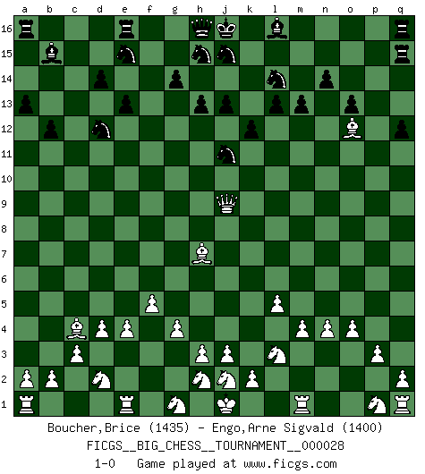 Last move : 1-0 2009 January 24 19:39:37 [Event "FICGS__BIG_CHESS__TOURNAMENT__000028"] [Site "FICGS"] [Date "2008.09.25"] [Round "1"] [White "Boucher,Brice"] [Black "Engo,Arne Sigvald"] [Result "1-0"] [WhiteElo "1435"] [BlackElo "1400"] 1.m2-m4 a15-a13 2.n2-n4 q15-q13 3.l2-l4 p15-p14 4.o1-n2 b15-b14 5.l1-o4 o16-p15 6.o4-c15 b14-b13 7.l4-l5 b16-c14 8.c15-n5 m15-m13 9.k1-l3 d15-d14 10.g2-g4 e15-e13 11.h1-b7 b13-b12 12.b7-f11 g16-e15 13.f11-f15 c16-b15 14.f15-o7 o15-o13 15.o7-p8 p16-o14 16.p8-p14 q16-q15 17.n2-h7 n15-n14 18.p14-p6 h14-h13 19.c2-c3 c14-d12 20.p2-p3 g15-g14 21.d2-d4 f16-l11 22.e2-e4 k15-k13 23.n5-p7 o14-n12 24.p7-l11 p15-l11 25.f1-c4 n12-m10 26.o2-o4 l15-l13 27.p6-p14 m16-q16 28.p14-p11 q13-q12 29.p11-l11 m10-l12 30.f2-f4 k13-k12 31.l11-j9 l12-j11 32.f4-f5 j14-j13 33.c1-o12 k16-l14 34.b1-d2 1-0 This big chess game has been lost on time (started : 2008.09.25 2:39:11) Follow this game move after move (download)I give 98 percent of my mental energy to Chess. Others give only 2 percent. (Bobby Fischer) Oft bringt ein stiller Zug das Erdbeben. (Richard Reti) El Jaque al descubierto es el bombardero del tablero. (Reuben Fine) Soyez une menace à chaque fois que vous vous asseyez pour jouer. (Ken Smith) Live, lose, and learn, by observing your opponent how to win. (Amber Steenbock)