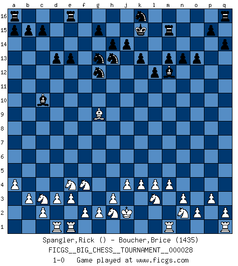 Last move : 1-0 2009 January 10 6:16:11 [Event "FICGS__BIG_CHESS__TOURNAMENT__000028"] [Site "FICGS"] [Date "2008.09.25"] [Round "1"] [White "Spangler,Rick"] [Black "Boucher,Brice"] [Result "1-0"] [WhiteElo ""] [BlackElo "1435"] 1.b2-b3 m15-m13 2.c1-b2 l15-l13 3.e2-e3 k16-l14 4.f1-c4 n15-n13 5.n2-n3 l16-o13 6.d2-d3 l13-l12 7.j2-g3 o16-l13 8.h1-o7 o13-p14 9.o7-f15 g16-f14 10.f15-c12 b16-c14 11.p2-p3 d15-d13 12.c12-c7 p16-n15 13.o1-p2 j15-h13 14.m2-m4 l13-m12 15.b1-c3 k15-k13 16.l1-m2 h16-k14 17.c7-c10 k14-g11 18.g1-e2 c16-k9 19.c10-g10 g11-g10 20.p2-g10 e15-e13 21.l2-l4 f16-b12 22.m2-b12 c14-b12 23.p1-n2 h15-g13 24.k1-l3 f14-g12 25.b2-a3 g12-j11 26.g10-c6 b12-c10 27.c6-a8 k9-g6 28.j3-j4 j16-k15 29.e2-f4 g6-e8 30.g3-e4 c10-e11 31.c4-a6 e8-c10 32.a8-b7 p14-l10 33.a1-d1 l14-k16 34.b7-h13 l10-h13 35.a6-h13 j11-h13 36.a3-n15 m16-m15 37.n15-g9 e11-g12 38.j1-j2 o15-o13 39.k2-k4 q15-q14 40.a2-a4 1-0 This big chess game has been lost on time (started : 2008.09.25 2:39:11) Follow this game move after move (download)Though most people love to look at the games of the great attacking masters, some of the most successful players in history have been the quiet positional players. They slowly grind you down by taking away your space, tying up your pieces, and leaving you with virtually nothing to do ! (Yasser Seirawan) Sitze auf Deine Hände. (Siegbert Tarrasch) Un Peón pasado aumenta su poder a medida de que el número de piezas en el tablero disminuye. (Capablanca) Les échecs sont un jeu terrible. Si vous n'avez pas le centre, votre adversaire a une position plus libre. Par contre, si vous avez le centre, alors vous avez vraiment quelque chose pour laquelle vous inquiéter ! (Siegbert Tarrasch) He who fights with monsters should be careful lest he thereby become a monster. (Friedrich Nietzsche, Beyond Good and Evil)