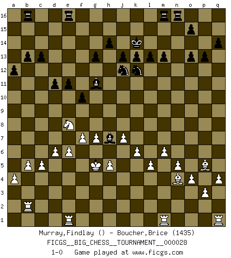 Last move : 1-0 2009 April 30 16:34:15 [Event "FICGS__BIG_CHESS__TOURNAMENT__000028"] [Site "FICGS"] [Date "2008.09.25"] [Round "1"] [White "Murray,Findlay"] [Black "Boucher,Brice"] [Result "1-0"] [WhiteElo ""] [BlackElo "1435"] 1.g2-g4 e15-e13 2.f2-f4 f15-f13 3.p2-p3 g16-f14 4.o1-p2 d15-d13 5.c2-c4 j15-h13 6.o2-o4 e13-e12 7.d2-d4 g15-g13 8.e2-e4 c15-c13 9.j2-k4 f13-f12 10.b2-b4 p15-p14 11.e4-e5 o16-p15 12.b1-c3 b16-c14 13.c1-b2 f16-d14 14.m2-m3 m15-m13 15.h1-o7 l16-o13 16.f4-f5 h16-k14 17.n2-n4 f12-f11 18.l1-n3 k14-n11 19.n3-j7 n11-j11 20.b4-b5 a16-b16 21.h3-h4 c16-h11 22.p1-o3 q15-q14 23.l2-l4 d13-d12 24.a2-a4 j11-j12 25.o7-j12 h11-j12 26.f1-l6 n15-n14 27.g1-h3 p16-n15 28.k1-l3 k16-l14 29.k4-h5 c14-e13 30.h3-k4 l14-j13 31.j1-j2 b15-b13 32.j2-h3 k15-k14 33.c3-d5 j16-j15 34.j3-j4 e13-c12 35.c4-c5 j12-k11 36.d5-f6 h15-f16 37.l3-k5 f16-e14 38.d4-d5 l15-l13 39.a1-b1 a15-a13 40.e5-e6 a13-a12 41.j4-j5 f14-g12 42.d5-d6 n15-l14 43.h2-j4 c12-e13 44.j4-h6 e13-c12 45.g4-g5 g12-j11 46.h5-k6 j11-h9 47.j7-l9 c12-e11 48.n4-n5 h9-k8 49.l6-j8 p15-m12 50.k4-h5 k11-n8 51.h3-g4 j13-k11 52.l9-p5 q16-n16 53.k2-k4 k11-h10 54.j8-o13 n14-o13 55.m3-m4 m12-p9 56.l4-l5 k14-k13 57.m4-m5 j15-k14 58.k5-j7 j14-j13 59.m5-m6 n8-m9 60.k4-k5 k8-j10 61.o3-m4 j10-k8 62.g5-g6 p9-n11 63.f6-h7 k8-h7 64.k6-h7 n11-j7 65.b2-j9 j7-o12 66.g6-g7 d14-f12 67.f5-f6 m9-l10 68.h5-k6 e11-g10 69.j9-k8 o12-k8 70.h7-k8 l10-m11 71.b1-b2 l14-k12 72.h4-h5 h10-j12 73.k6-h7 k12-l10 74.m4-l6 l10-k8 75.l6-k8 g10-j9 76.h7-g9 h13-k12 77.j5-j6 d12-d11 78.k5-k6 e14-d12 79.f6-f7 d12-e10 80.h6-j8 e10-g9 81.j8-g9 f11-f10 82.g9-e8 e12-e11 83.q2-q4 p14-p13 84.j6-j7 j9-h7 85.k8-h7 m11-h7 86.g4-g5 f12-g11 87.p2-n4 1-0 This big chess game has been lost on time (started : 2008.09.25 2:39:11) Follow this game move after move (download)By playing at Chess then, we may learn: First: Foresight... Second: Circumspection... Third: Caution... And lastly, we learn by Chess the habit of not being discouraged by present bad appearances in the state of our affairs, the habit of hoping for a favorable chance, and that of persevering in the secrets of resources. (Benjamin Franklin) Ich hatte Zahnschmerzen im ersten Spiel. In der zweiten Partie tat mir der Kopf weh. In der dritten war es eine Rheuma-Attacke und während der vierten fühlte ich mich nicht gut. Und in der fünften? Nun, man muss doch nicht jedes Spiel gewinnen, oder? (Savielly Grigorievitsch Tartakower) Debes de llevar a tu oponente hacia un profundo y obscuro bosque donde 2+2=5, y el camino que conduce a la salida es suficientemente ancho para solamente uno. (Mikhail Tal) Shah mat. Le roi est mort. Cri de fierté d'un joueur venant de terrasser son adversaire, courtoisement, sans effusion de sang. The Internet is so big, so powerful and pointless that for some people it is a complete substitute for life. (Andrew Brown)