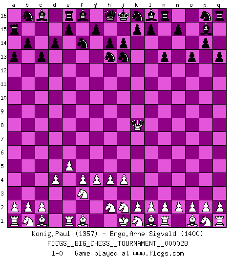 Last move : 1-0 2008 December 31 4:50:0 [Event "FICGS__BIG_CHESS__TOURNAMENT__000028"] [Site "FICGS"] [Date "2008.09.25"] [Round "1"] [White "Konig,Paul"] [Black "Engo,Arne Sigvald"] [Result "1-0"] [WhiteElo "1357"] [BlackElo "1400"] 1.g2-g4 q15-q13 2.f2-f4 a15-a13 3.e2-e4 b15-b14 4.h3-h4 p15-p14 5.d2-d4 o16-p15 6.e4-e5 m15-m13 7.h1-c6 c15-c13 8.c6-g10 a16-a15 9.g10-f10 h15-j13 10.f10-f15 g16-f14 11.f15-n8 j15-h13 12.n8-k8 d15-d14 13.j3-j4 o15-o13 14.g1-f3 1-0 This big chess game has been lost on time (started : 2008.09.25 2:39:11) Follow this game move after move (download)I like to say that Bobby Fischer was the greatest player ever. But what made Fischer a genius was his ability to blend an American freshness and pragmatism with Russian ideas about strategy. (Bruce Pandolfini) Gott hat gewollt, dass ich Champion werde. (Surab Azmajparaschvili) Alekhine es un poeta que crea un trabajo de arte de algo que raramente inspiraría a otra persona a mandar una tarjeta postal. (Max Euwe) Des idées, des idées, j'en ai cent, j'en ai mille. Des bonnes, des mauvaises, applicables, irréalisables... Il suffit de faire le tri ! (Roos) In fact if nothing is done against this teddy bear, hereby I announce that I would quit chess, rapid chess, blitz chess, postal chess, email chess, server chess and correspondence chess I will then switch to a table game where teddy bears aren't going to be seen for a while, like Poker, or Roulette, all 18+ games. (Elmer Valderrama)
