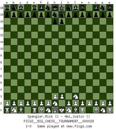 Last move : 1-0 2008 September 26 11:33:12 [Event "FICGS__BIG_CHESS__TOURNAMENT__000028"] [Site "FICGS"] [Date "2008.09.25"] [Round "1"] [White "Spangler,Rick"] [Black "Ami,Justin"] [Result "1-0"] [WhiteElo ""] [BlackElo ""] 1.j2-l3 1-0 Follow this game move after move (download)In a gambit you give up a Pawn for the sake of getting a lost game. (Samuel Standige Boden) Es ist wirklich schade, dass so viele Schachspieler nicht auf ihr Äußeres achten! (Alexandra Kosteniuk) ¿Quién es tu oponente esta tarde? Esta tarde mi oponente son las piezas negras. (Akiba Rubinstein) Les échecs c'est le défi de l'alpiniste, toujours plus haut, prêt à tout pour monter à l'assaut du Roi ennemi. Les échecs, c'est de la musique en mouvement, un ballet majestueux pour les yeux. C'est de la poésie composée par les fantômes du passé qui au même titre que Rimbaud ou Verlaine méritent notre admiration. Les échecs, c'est de la peinture ou le moindre mouvement modifie le tableau pour en faire un Picasso ou un Van Gogh. Les échecs, c'est tout et rien, c'est la vie et la mort. Jjulie33 sur le forum de France-Echecs. When you don't know what to do, walk fast and look worried. (Anonymous)