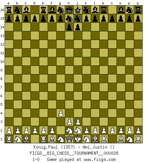 Last move : 1-0 2008 September 26 11:33:41 [Event "FICGS__BIG_CHESS__TOURNAMENT__000028"] [Site "FICGS"] [Date "2008.09.25"] [Round "1"] [White "Konig,Paul"] [Black "Ami,Justin"] [Result "1-0"] [WhiteElo "1357"] [BlackElo ""] 1.g2-g4 1-0 Follow this game move after move (download)During a Chess competition a Chessmaster should be a combination of a beast of prey and a monk. (Alexander Alekhine) Ich verstehe den Grund nicht, warum die Aufteilung in Frauen und Männer überhaupt im Schach besteht. (Judith Polgar) Los asuntos humanos son como una partida de Ajedrez: solo aquellos que no lo toman seriamente, pueden ser llamados buenos jugadores. (Hung Tzu Ch'eng) Ce qui caractérise les parties de combat, c'est que si le défenseur a constamment de difficiles problèmes à résoudre, l'attaquant doit chercher sans relâche de nouvelles possibilités d'attaque. (Koblentz) When a man with money meets a man with experience, the man with experience leaves with money and the man with money leaves with experience. (Anonymous)