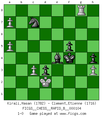 Last move : 1-0 2009 February 19 9:27:28 [Event "FICGS__CHESS__RAPID_B__000104"] [Site "FICGS"] [Date "2008.09.25"] [Round "1"] [White "Kirali,Hasan"] [Black "Clement,Etienne"] [Result "1-0"] [WhiteElo "1782"] [BlackElo "1716"] 1.e4 e5 2.d4 exd4 3.Qxd4 Nc6 4.Qe3 Nf6 5.Nc3 Bb4 6.Bd2 O-O 7.O-O-O Re8 8.Qg3 Rxe4 9.a3 Bd6 10.f4 Re8 11.Nf3 Bf8 12.Bd3 d5 13.Rhe1 Rxe1 14.Rxe1 d4 15.Ne4 Bf5 16.Nxf6+ Qxf6 17.Bc4 Be7 18.Ng5 Rf8 19.Qb3 h6 20.Nxf7 Rxf7 21.Qxb7 Kf8 22.Qxc7 Qd6 23.Qxd6 Bxd6 24.Bxf7 Kxf7 25.g3 a5 26.a4 Bg4 27.Rh1 Ke6 28.h3 Bf3 29.Re1+ Kd7 30.g4 Be7 31.g5 h5 32.f5 Bg2 33.f6 gxf6 34.g6 Ke8 35.Rg1 Bd5 36.Bh6 Bd6 37.g7 Ne7 38.Bd2 Bc7 39.c3 d3 40.Bh6 Bh2 41.Rf1 Kf7 42.Kd2 Be4 43.b4 Bg3 44.Bg5 Be5 45.Bf4 Bxf4+ 46.Rxf4 f5 47.bxa5 Kxg7 48.Rf1 Kf6 49.Rb1 Ke5 50.a6 Nc8 51.Rb7 h4 52.a5 Nd6 53.Rb4 Ne8 54.a7 Nc7 55.Rb8 Kf4 56.Rg8 1-0 This chess game has been lost on time (started : 2008.09.25 12:50:54) Centre game : Berger variation Kingside Castling by player Black (move 6) Queenside Castling by player White (move 7) Player White won this chess game. Follow this game move after move (download)I thought the most common mistake [in chess] was the first one: Learning the game :P (Garvin Gray, FICGS forum) Als er Schachweltmeister wurde ließ er praktisch alle stärksten Sovietspieler für sich arbeiten. Wenn ein auch nur mittelmässiger Meister ein Spezialist für eine bestimmte Eröffnung war, wurde er von Karpov gerufen. Das wurde alles geheim gehalten. (Mikhail Moiseyevich Botvinik) No hay precio que sea tan grande por la cabellera del Rey enemigo. (Koblentz) Nous sommes les pions de la mystérieuse partie d'Echecs jouée par Dieu. Il nous déplace, nous arrête, nous pousse encore, puis nous lance un à un dans la boîte du Néant. Epitaphe sur la tombe de David Janowsky (1868-1927). Mandala - that's it! 16x16 squares as multiple of the four and the eight because of the Four Noble Truths and the Noble Eightfold Path. (Heinz-Georg Lehnhoff about Big Chess)