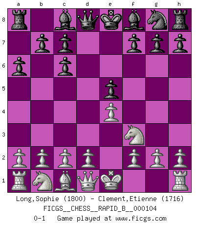 Last move : 0-1 2008 November 8 14:14:18 [Event "FICGS__CHESS__RAPID_B__000104"] [Site "FICGS"] [Date "2008.09.25"] [Round "1"] [White "Long,Sophie"] [Black "Clement,Etienne"] [Result "0-1"] [WhiteElo "1800"] [BlackElo "1716"] 1.e4 e5 2.Nf3 Nc6 3.Bb5 a6 4.Bxc6 dxc6 0-1 This chess game has been lost on time (started : 2008.09.25 12:50:54) Ruy Lopez : Exchange variation Player Black won this chess game. Follow this game move after move (download)We must make sure that Chess will not be like a dead language, very interesting, but for a very small group. (Sytze Faber) Früher wurde jeder komplizierte Zug, jedes interessante Opfer mit großem Beifall und Enthusiasmus aufgenommen. Heute schaltet man einfach seinen Fritz an, und man kann sehen, was los ist, ob der Zug geht oder nicht. (Vladimir Kramnik) Bobby Fischer es el mas grande genio de Ajedrez de todos los tiempos. (Alexander Kotov) Plusieurs personnes se sont demandées comment Tal faisait pour gagner... En fait, c'est très simple ! Il met ses pièces au centre de l'échiquier et les sacrifie quelque part ! (David Bronstein) The leaves of memory seemed to make a mournful rustling in the dark. (Henry Wadsworth Longfellow)
