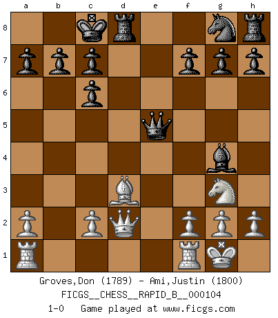 Last move : 1-0 2008 October 10 11:29:5 [Event "FICGS__CHESS__RAPID_B__000104"] [Site "FICGS"] [Date "2008.09.25"] [Round "1"] [White "Groves,Don"] [Black "Ami,Justin"] [Result "1-0"] [WhiteElo "1789"] [BlackElo "1800"] 1.e4 e5 2.Nf3 Nc6 3.d4 exd4 4.Nxd4 Bc5 5.Nxc6 Qf6 6.Qd2 dxc6 7.Nc3 Bd4 8.Bd3 Bg4 9.O-O O-O-O 10.Ne2 Bxb2 11.Bxb2 Qxb2 12.e5 Qxe5 13.Ng3 1-0 Scotch game Kingside Castling by player White (move 9) Queenside Castling by player Black (move 9) Player White won this chess game. Follow this game move after move (download)Chess is the art of analysis. (Mikhail Botvinnik) Ihnen, Herr Lasker, habe ich nur drei Worte zu sagen: Schach und matt. (Siegbert Tarrasch) El sobresalir en el Ajedrez es un signo de una mente intrigante. (Sir Arthur Conan Doyle) Les échecs sont utiles à l'exercice de la faculté de penser et à celle de l'imagination. Car nous devons posséder une méthode élaborée pour atteindre des buts partout où nous devons conduire notre raison. (Leibnitz) Nobody is always a winner, and anybody who says he is, is either a liar or doesn't play poker. (Amarillo Slim)