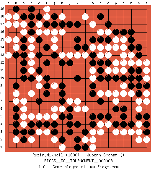Last move : 1-0 2007 February 11 18:36:29 [Event "FICGS__GO__TOURNAMENT__000008"] [Site "FICGS"] [Date "2006.08.12"] [Round "1"] [Black "Ruzin,Mikhail"] [White "Wyborn,Graham"] [Result "1-0"] [Rating 1 "1800"] 1.q16 c4 2.q4 d15 3.d17 f16 4.c15 c16 5.d16 c17 6.c18 b18 7.d18 b15 8.c14 b14 9.e15 d14 10.c13 d13 11.c12 d12 12.c11 d11 13.c10 e9 14.b19 a18 15.b16 e3 16.d10 h16 17.e11 g9 18.f12 f18 19.k17 g14 20.f14 n16 21.k15 h13 22.h12 j13 23.j12 l13 24.k14 k13 25.m15 n13 26.n15 o14 27.o15 q14 28.q10 d8 29.k4 h3 30.n10 b8 31.k10 b17 32.a16 a15 33.b13 m3 34.m4 n3 35.l3 n4 36.m5 p3 37.n5 q3 38.p4 o4 39.o5 f13 40.e13 r3 41.r4 s4 42.s5 s2 43.t4 r8 44.r9 h18 45.g17 a17 46.h17 m11 47.m12 r12 48.m13 o11 49.n11 q8 50.o10 p11 51.p10 p5 52.q6 s3 53.q5 m17 54.o17 g16 55.f17 e17 56.j17 q9 57.r11 q11 58.p13 p14 59.o12 q12 60.n12 q13 61.r15 o13 62.s13 s12 63.s11 t12 64.r14 p12 65.b4 p7 66.p6 p8 67.c3 c5 68.d3 f3 69.d4 d5 70.b5 c6 71.e4 e5 72.f4 f5 73.g4 g5 74.h5 j7 75.h7 h6 76.j6 g6 77.j5 k7 78.h8 s9 79.r10 k6 80.h9 r13 81.s14 t11 82.s10 t10 83.s8 s7 84.t9 t7 85.f8 l2 86.k2 m2 87.e7 e16 88.g13 g15 89.e18 a13 90.b9 c7 91.b6 b7 92.f9 e10 93.f10 s6 94.t5 t8 95.s9 m10 96.m9 b2 97.b3 n8 98.n7 c19 99.d19 l18 100.n18 f19 101.g18 l6 102.m8 o8 103.g3 h4 104.h2 g2 105.j3 q15 106.r16 m14 107.l14 n14 108.t3 t2 109.l1 m1 110.k1 h1 111.j4 d2 112.c2 o16 113.p16 p15 114.pass pass 115.pass 1-0 Comment by player 1 : Mikhail Ruzin : You have the one alive groop (m1-t2) only. All other booard is black's territory. Score by Multigo: Chinese Rule: White: 30.75 = 27 (Points) + 0 (Shared) / 2 + 7.5 (Komi) / 2 Black: 330.25 = 334 (Points) + 0 (Shared) / 2 - 7.5 (Komi) / 2 B + 149.75 Japanese Rule: White: 23.5 = 13 (Territory) + 3 (Black's Dead) + 7.5 (Komi) Black: 323 = 224 (Territory) + 99 (White's Dead) B + 299.5 Here are the names of the openings (joseki) played in the four corners : Corner d16 : d15 d17 Takamoku (Gomok, Gaomu`) 5-4 Point. The takamoku (high) point (5-4). With its emphasis on influence, the 5-4 point complements the 4-4 (hoshi) point in creating an influence-oriented fuseki. Komoku. White responds with 3-3, 3-5, 4-6, 4-7, 3-6, 3-7. Corner q16 : q16 n16 Hoshi (Hwajeom, Seongjeom, Xingwei`) 4-4 Point. The star or hoshi (4-4) point, emphasizing influence at the potential expense of territory. Nikken Takagakari (Dukan Nop'dakeolch'im, E`r Gaojia, 2-Space High Approach). White 2 is a light approach move. Rarely played in even games, White 2 is typically employed in handicap games. Black continues with 6-4 or 3-10. In Korean Sunjang Baduk Black has a stone on 8-4. Corner q4 : q4 m3 Hoshi (Hwajeom, Seongjeom, Xingwei`) 4-4 Point. The star or hoshi (4-4) point, emphasizing influence at the potential expense of territory. Player Black won this Go (weiqi, baduk) game. Follow this game move after move (download)Each step in a ladder is worth 7 points. (Anonymous) Begin at the beginning and go on till you come to the end; then stop. (Lewis Carrol, Alice in Wonderland)