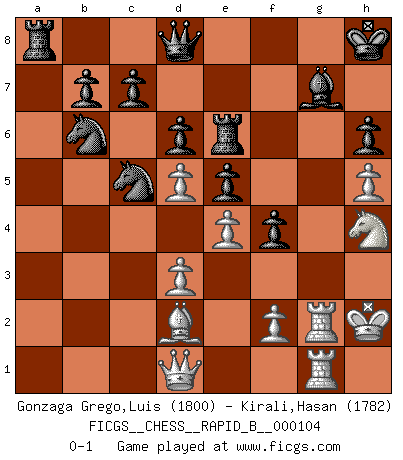 Last move : 0-1 2008 November 7 21:41:56 [Event "FICGS__CHESS__RAPID_B__000104"] [Site "FICGS"] [Date "2008.09.25"] [Round "1"] [White "Gonzaga Grego,Luis"] [Black "Kirali,Hasan"] [Result "0-1"] [WhiteElo "1800"] [BlackElo "1782"] 1.c4 Nf6 2.Nc3 g6 3.g3 Bg7 4.Bg2 O-O 5.Nf3 d6 6.O-O e5 7.d3 Nc6 8.Rb1 a5 9.a3 h6 10.b4 axb4 11.axb4 Be6 12.b5 Ne7 13.h3 Qc8 14.Kh2 Re8 15.e4 Nd7 16.Be3 f5 17.Nd5 g5 18.b6 Bxd5 19.cxd5 f4 20.gxf4 gxf4 21.Bd2 Nxb6 22.h4 Qd8 23.Bh3 Ng6 24.Qc2 Kh8 25.Rg1 Nf8 26.Rg2 Re7 27.Rbg1 Nfd7 28.h5 Rf7 29.Be6 Re7 30.Qd1 Nc5 31.Nh4 Rxe6 0-1 English Opening Kingside Castling by player Black (move 4) Kingside Castling by player White (move 6) Player Black won this chess game. Follow this game move after move (download)Chess books should be used as we use glasses: to assist the sight, although some players make use of them as if they thought they conferred sight. (Jose Raul Capablanca) Alles was am Schachbrett zählt sind gute Züge. (Robert James Fischer) Tu no necesitas jugar muy bien, únicamente ayudar a tu oponenet a que juegue muy mal. (Genrikh Chepukaitis) C'est la seule position que je connaisse où les deux camps sont mals. Propos prêtés à V. Anand. 98% of all statistics are made up. (Author unknown)