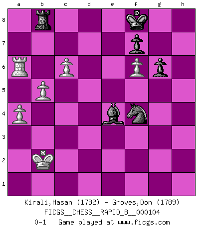 Last move : 0-1 2008 October 23 22:11:50 [Event "FICGS__CHESS__RAPID_B__000104"] [Site "FICGS"] [Date "2008.09.25"] [Round "1"] [White "Kirali,Hasan"] [Black "Groves,Don"] [Result "0-1"] [WhiteElo "1782"] [BlackElo "1789"] 1.e4 c5 2.Nf3 d6 3.d4 cxd4 4.Nxd4 Nf6 5.Nc3 a6 6.Be3 e6 7.f3 b5 8.Qd2 Nbd7 9.g4 b4 10.Nce2 h6 11.O-O-O Qc7 12.Qxb4 d5 13.Qc3 Qxc3 14.Nxc3 e5 15.Nde2 d4 16.Nxd4 exd4 17.Bxd4 Bc5 18.Bxc5 Nxc5 19.Bc4 O-O 20.h4 Be6 21.Be2 Rab8 22.Rd6 a5 23.Rhd1 Rfc8 24.Ba6 Nxa6 25.Rxa6 Ra8 26.Rxa8 Rxa8 27.b3 Nd7 28.g5 Rc8 29.Kb2 h5 30.Rd6 Kf8 31.Ra6 Ne5 32.f4 Nf3 33.f5 Bd7 34.Rxa5 Bc6 35.b4 Nxh4 36.f6 g6 37.a4 Nf3 38.b5 Rb8 39.Ra6 Ba8 40.Ne2 h4 41.Nf4 Bxe4 42.c4 Nxg5 43.c5 h3 44.Nxh3 Nxh3 45.c6 Nf4 0-1 Sicilian : Najdorf, Byrne (English) attack Queenside Castling by player White (move 11) Kingside Castling by player Black (move 19) Player Black won this chess game. Follow this game move after move (download)It is no time to be playing Chess when the house is on fire. (Italian Proverb) Ich hatte Zahnschmerzen im ersten Spiel. In der zweiten Partie tat mir der Kopf weh. In der dritten war es eine Rheuma-Attacke und während der vierten fühlte ich mich nicht gut. Und in der fünften? Nun, man muss doch nicht jedes Spiel gewinnen, oder? (Savielly Grigorievitsch Tartakower) Cuando tu casa esta en llamas, no puedes ser molestado por tus vecinos. O, como decinos en Ajedrez, si tu Rey esta bajo ataque, no te preocupa perder un Peón del lado de la Reina. (Gary Kasparov) Le génie consiste à savoir transgresser les règles au moment opportun. (Teichmann) The next best thing to gambling and winning is gambling and loosing. (Nick Dandalos)