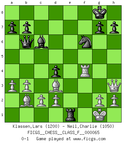 Last move : 0-1 2009 February 24 21:40:38 [Event "FICGS__CHESS__CLASS_F__000065"] [Site "FICGS"] [Date "2008.09.25"] [Round "1"] [White "Klassen,Lars"] [Black "Neil,Charlie"] [Result "0-1"] [WhiteElo "1200"] [BlackElo "1050"] 1.Nc3 Nf6 2.e4 e5 3.Bc4 Bc5 4.a3 d6 5.Nf3 c6 6.Ng5 d5 7.exd5 Ng4 8.Nce4 cxd5 9.Bb5+ Bd7 10.Nxf7 Bxf2+ 11.Nxf2 Kxf7 12.Nxg4 Re8 13.Nxe5+ Kf8 14.O-O Kg8 15.Bd3 Rxe5 16.Qf3 Bc6 17.b3 Qb6+ 18.Kh1 Nd7 19.Bb2 d4 20.Qh3 Nf6 21.Rf4 Rae8 22.Kg1 Re1+ 23.Rxe1 Rxe1+ 0-1 This chess game has been lost on time (started : 2008.09.25 16:25:9) Dunst (Sleipner, Heinrichsen) Opening Kingside Castling by player White (move 14) Player Black won this chess game. Follow this game move after move (download)I guess a certain amount of temperament is expected of Chess geniuses. (Ron Gross) Gewöhnliche Menschen denken nur daran, wie sie ihre Zeit verbringen. Ein intelligenter Mensch versucht, sie auszunutzen. (Arthur Schopenhauer) En un gambito tu regalas un Peón por el bién de tomar un juego perdido. (Samuel Standige Boden) La vérité est comme le meilleur coup aux échecs : elle existe, mais il faut la chercher. (Arturo Perez-Reverte) The weakness of an artist is dogma. (Josh Waitzkin)