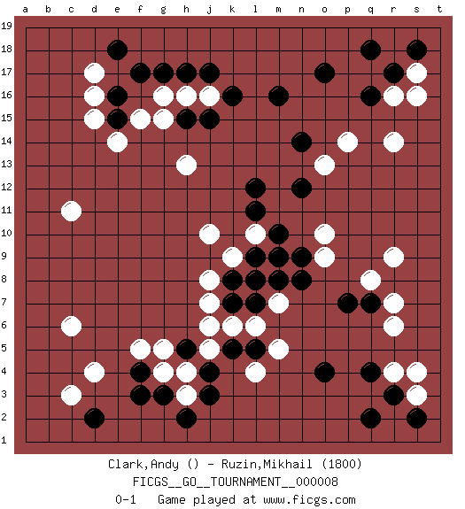 Last move : 0-1 2006 August 30 17:51:59 [Event "FICGS__GO__TOURNAMENT__000008"] [Site "FICGS"] [Date "2006.08.12"] [Round "1"] [Black "Clark,Andy"] [White "Ruzin,Mikhail"] [Result "0-1"] [Rating 2 "1800"] 1.q4 d17 2.q16 d4 3.f3 c6 4.d2 c3 5.j3 r6 6.o4 s4 7.r3 r9 8.f17 d15 9.j17 r14 10.o17 s16 11.r17 p14 12.m16 f5 13.h5 g4 14.g3 h4 15.j4 h3 16.h2 j5 17.k5 j6 18.f4 g5 19.l5 c11 20.k7 j7 21.k8 j8 22.n8 g15 23.j15 h13 24.e16 d16 25.e15 e14 26.e18 h16 27.h15 f15 28.g17 g16 29.h17 j16 30.k16 j10 31.l12 o9 32.n9 o10 33.p7 q8 34.q7 r7 35.n14 o13 36.n12 s17 37.s18 r16 38.q18 s3 39.s2 r4 40.q2 k9 41.l9 l10 42.m10 l8 43.m9 k6 44.l7 l6 45.m8 m7 46.l8 m5 47.l11 l4 0-1 Comment by player 1 : Andy Clark : Thankyou Here are the names of the openings (joseki) played in the four corners : Corner d4 : d4 f3 Hoshi (Hwajeom, Seongjeom, Xingwei`) 4-4 Point. The star or hoshi (4-4) point, emphasizing influence at the potential expense of territory. Ikken Kakari (Hankan Keolch'im, Yi Gua`jiao~, 1-Space Low Approach). Black 2 is the standard approach move to the 4-4. Corner q4 : q4 r6 Hoshi (Hwajeom, Seongjeom, Xingwei`) 4-4 Point. The star or hoshi (4-4) point, emphasizing influence at the potential expense of territory. Ikken Kakari (Hankan Keolch'im, Yi Gua`jiao~, 1-Space Low Approach). White 2 is the standard approach move to the 4-4. Corner d16 : d17 f17 Komoku (Somok, Xiao~mu`) 3-4 Point. The komoku (3-4) point is the traditional corner enclosure move.. Corner q16 : q16 r14 Hoshi (Hwajeom, Seongjeom, Xingwei`) 4-4 Point. The star or hoshi (4-4) point, emphasizing influence at the potential expense of territory. Ikken Kakari (Hankan Keolch'im, Yi Gua`jiao~, 1-Space Low Approach). White 2 is the standard approach move to the 4-4. Player White won this Go (weiqi, baduk) game. Follow this game move after move (download)Stop on second, extend on third. (Anonymous) Life is like a play: it's not the length but the excellence of the acting that matters. (Seneca)