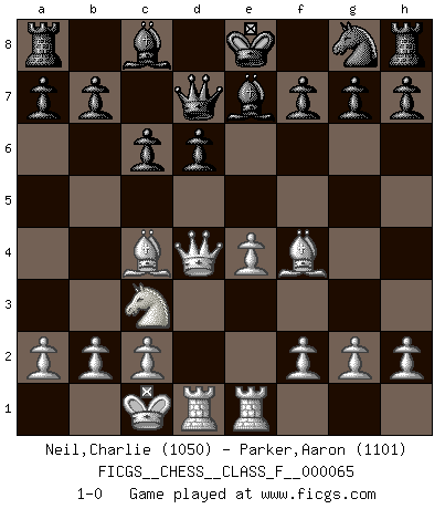 Last move : 1-0 2008 October 2 16:55:17 [Event "FICGS__CHESS__CLASS_F__000065"] [Site "FICGS"] [Date "2008.09.25"] [Round "1"] [White "Neil,Charlie"] [Black "Parker,Aaron"] [Result "1-0"] [WhiteElo "1050"] [BlackElo "1101"] 1.e4 e5 2.Nf3 Nc6 3.d4 exd4 4.Nxd4 Nxd4 5.Qxd4 d6 6.Bc4 Qe7 7.Nc3 c6 8.Bf4 Qd7 9.O-O-O Be7 10.Rhe1 1-0 Scotch game Queenside Castling by player White (move 9) Player White won this chess game. Follow this game move after move (download)Daring ideas are like Chess men moved forward. They may be beaten, but they may start a winning game. (Johann Wolfgang von Goethe) Schach sollte überall auf der Welt Schulfach werden. Es fördert die geistige Auseinandersetzung. Es lehrt die Demut in der Niederlage. (Garry Kasparov) Los Peones son el alma de una partida de Ajedrez. (Francois Andre Danican Philidor) Les Echecs mettent en conflit, non pas deux intelligences, mais deux volontés. (Lasker) All politicians must be presumed guilty until they are proven innocent. (Dinesh De Silva)