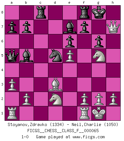 Last move : 1-0 2008 October 12 20:32:4 [Event "FICGS__CHESS__CLASS_F__000065"] [Site "FICGS"] [Date "2008.09.25"] [Round "1"] [White "Stoyanov,Zdravko"] [Black "Neil,Charlie"] [Result "1-0"] [WhiteElo "1334"] [BlackElo "1050"] 1.e4 c6 2.Nf3 d5 3.e5 e6 4.d4 c5 5.c4 Nc6 6.Be3 cxd4 7.Bxd4 Nxd4 8.Qxd4 Qa5+ 9.Nbd2 Bc5 10.Qf4 Ne7 11.cxd5 Nxd5 12.Qc4 O-O 13.Bd3 Bd7 14.O-O Rac8 15.Qe4 g6 16.a3 Bc6 17.Qh4 Be7 18.Ng5 Bb5 19.Qxh7+ 1-0 Caro-Kann defense Kingside Castling by player Black (move 12) Kingside Castling by player White (move 14) Player White won this chess game. Follow this game move after move (download)I won't play with you anymore. You have insulted my friend. - When an opponent cursed himself for a blunder. (Miguel Najdorf) Ich organisiere ein großes Turnier, was mich etwa 120000 Dollar kostet. Ich denke, das ist das erste Mal in der Schachgeschichte, daß ein Schachgroßmeister auch als Mäzen auftritt. (Miguel Najdorf) Una victoria por una combinación errónea, aunque sea espectacular, me llena de horror artístico. (Wilhelm Steinitz) Même si vous avez un bon coup à faire, regardez toujours s'il n'y en a pas un qui lui soit préférable. (Pedro Damiano) Drag your thoughts away from your troubles... by the ears, by the heels, or any other way you can manage it. (Mark Twain)