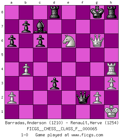 Last move : 1-0 2008 October 15 19:10:47 [Event "FICGS__CHESS__CLASS_F__000065"] [Site "FICGS"] [Date "2008.09.25"] [Round "1"] [White "Barradas,Anderson"] [Black "Renault,Herve"] [Result "1-0"] [WhiteElo "1210"] [BlackElo "1254"] 1.e4 e5 2.Nf3 Nc6 3.Bb5 Nf6 4.d3 Bc5 5.Bg5 Qe7 6.O-O Nd4 7.Nxd4 Bxd4 8.c3 a6 9.Bc4 Bb6 10.Nd2 O-O 11.Nf3 d6 12.d4 Bg4 13.Qd3 Rad8 14.Bxf6 Qxf6 15.Rfe1 Qg6 16.Nh4 Qg5 17.Nf3 Qf6 18.Re3 c6 19.h3 Be6 20.Bxe6 fxe6 21.b4 exd4 22.e5 dxe5 23.cxd4 exd4 24.Re4 Qf5 25.Rae1 Rde8 26.Qd2 Qg6 27.Rg4 Qf5 28.Re5 Qf6 29.Qd3 Rd8 30.Rh5 g6 31.Rh6 Qf7 32.Kh2 Kg7 33.Rgh4 Bc7+ 34.Kh1 Rh8 35.Qe4 d3 36.Ng5 Qxf2 37.Nxe6+ Kg8 38.Rxg6+ hxg6 39.Qxg6+ 1-0 Ruy Lopez : Berlin defense Kingside Castling by player White (move 6) Kingside Castling by player Black (move 10) Player White won this chess game. Follow this game move after move (download)First-class players lose to second class players because second-class players sometimes play a first-class game. (Tarrasch) Wenn man heute mit 14 Jahren noch kein GM ist, kann man es vergessen. (Viswanathan Anand) Los asuntos humanos son como una partida de Ajedrez: solo aquellos que no lo toman seriamente, pueden ser llamados buenos jugadores. (Hung Tzu Ch'eng) Nous vivons dans un monde échiquéen : chaque jour qui passe est un défi à relever. (Philosophe Sasha) To send light into the darkness of men's hearts - such is the duty of the artist. (Schumann)
