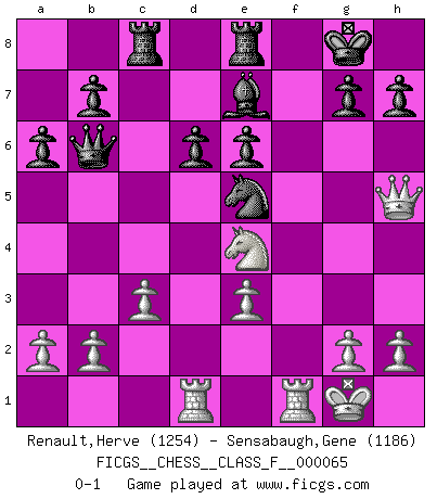 Last move : 0-1 2008 November 7 20:8:3 [Event "FICGS__CHESS__CLASS_F__000065"] [Site "FICGS"] [Date "2008.09.25"] [Round "1"] [White "Renault,Herve"] [Black "Sensabaugh,Gene"] [Result "0-1"] [WhiteElo "1254"] [BlackElo "1186"] 1.e4 c5 2.Nf3 d6 3.d4 cxd4 4.Qxd4 a6 5.Bc4 Nc6 6.Qd5 Be6 7.Qd3 Bxc4 8.Qxc4 Nf6 9.Nc3 e6 10.Be3 Be7 11.O-O Rc8 12.Ng5 Ng4 13.Qe2 Nxe3 14.Nxf7 Kxf7 15.fxe3 Bf6 16.Rad1 Re8 17.Qh5+ Kg8 18.e5 Nxe5 19.Ne4 Be7 20.c3 Qb6 0-1 Sicilian, Chekhover variation Kingside Castling by player White (move 11) Player Black won this chess game. Follow this game move after move (download)The combination player thinks forward; he starts from the given position, and tries the forceful moves in his mind. (Emanuel Lasker) In der Schule lernt man nichts. Es ist nur Zeitverschwendung. (Robert James Fischer) Un mal plan es mejor que no tener ningún plan. (Frank Marshall) L'attaque fait le spectacle, la défense gagne les matchs. (Dicton footballistique) History is a gallery of pictures in which there are few originals and many copies. (Alexis de Tocqueville)