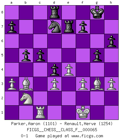 Last move : 0-1 2008 October 2 16:56:31 [Event "FICGS__CHESS__CLASS_F__000065"] [Site "FICGS"] [Date "2008.09.25"] [Round "1"] [White "Parker,Aaron"] [Black "Renault,Herve"] [Result "0-1"] [WhiteElo "1101"] [BlackElo "1254"] 1.e4 e5 2.Bc4 Bc5 3.a3 Qf6 4.Nh3 d6 5.Qe2 Bxh3 6.gxh3 Qg6 7.Qf3 Nf6 8.Nc3 O-O 9.d3 Nc6 10.Na4 Nd4 11.Qd1 Qg2 12.Rf1 Nf3+ 13.Ke2 Bd4 14.c3 Nxh2 15.cxd4 Nxf1 16.Qxf1 Qxf1+ 17.Kxf1 exd4 18.b4 Rad8 19.Bf4 Nd7 20.Bd5 b5 21.Nb2 Nf6 22.Bb3 c5 23.Bg5 h6 24.Bh4 Rfe8 25.bxc5 g5 26.Bg3 dxc5 27.f3 Re7 28.Rc1 Nd7 0-1 Bishop's Opening : Classical variation Kingside Castling by player Black (move 8) Player Black won this chess game. Follow this game move after move (download)Those who say they understand Chess, understand nothing. (Robert Hubner) Obendrein hat der FIDE-Präsident den Revolutionsführer Gaddafi zum »Großmeister« ernannt, am Ende der WM. Das ist lächerlich! (Joel Lautier) Botvinnik trató de alejar el misterio referente al Ajedrez, siempre relacionandolo a situaciones de la vida diaria. Solía llamar al Ajedrez un problema inexacto típico, similar a aquellos en que la gente tiene siempre que resolver a cada día. (Garry Kasparov) Une platitude souvent récitée à propos des Echecs est qu'une des choses les plus difficiles à réaliser est de gagner une position gagnante. Cela ne manque pas de sens mais, pour ma part, j'ai toujours trouvé plus difficile de gagner une position perdante. (Tim Krabbe) A good book on your shelf is a friend that turns its back on you and remains a friend. (Author unknown)