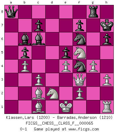 Last move : 0-1 2009 February 13 21:7:35 [Event "FICGS__CHESS__CLASS_F__000065"] [Site "FICGS"] [Date "2008.09.25"] [Round "1"] [White "Klassen,Lars"] [Black "Barradas,Anderson"] [Result "0-1"] [WhiteElo "1200"] [BlackElo "1210"] 1.c3 e5 2.e4 Nf6 3.d3 d5 4.Nd2 dxe4 5.dxe4 Nc6 6.h3 Bc5 7.Bc4 O-O 8.Ngf3 a6 9.Ng5 h6 10.Ngf3 b5 11.Bb3 Bb7 12.Nh4 g6 13.Nxg6 Kg7 14.Nh4 Ne7 15.Qf3 Ng6 16.Nf5+ Kh7 17.g4 Nf4 18.Bc2 Rg8 19.b4 Bb6 20.a4 Bc6 21.axb5 axb5 22.Rxa8 Qxa8 23.Ne7 Re8 24.Nf5 Rg8 0-1 This chess game has been lost on time (started : 2008.09.25 16:25:9) Saragossa Opening Kingside Castling by player Black (move 7) Player Black won this chess game. Follow this game move after move (download)There is only one thing Fischer does in Chess without pleasure: to lose ! (Boris Spassky) Fallen sollten polizeilich verboten werden. (Savielly Grigorievitsch Tartakower) Mi estilo es algo parecido entre un poco de Tal y Petrosian. (Reshevsky) Ne tendez aucun piège pour le plaisir ! Ne jouez rien dans l'espoir que l'adversaire réagisse de façon stupide ! Prenez toujours pour acquis que l'adversaire va trouver le meilleur coup ! Ne jouez jamais de coup dans l'espoir que l'adversaire ne voie pas la menace ! Chacun de vos coups doit améliorer la position d'une façon ou d'une autre. A good aphorism is too hard for the tooth of time, and is not worn away with the centuries, although it serves as food for every speech. (Friedrich Nietzsche)