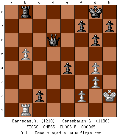 Last move : 0-1 2008 December 17 23:41:39 [Event "FICGS__CHESS__CLASS_F__000065"] [Site "FICGS"] [Date "2008.09.25"] [Round "1"] [White "Barradas,Anderson"] [Black "Sensabaugh,Gene"] [Result "0-1"] [WhiteElo "1210"] [BlackElo "1186"] 1.e4 c5 2.Nf3 d6 3.d4 cxd4 4.Nxd4 Nf6 5.Bd3 Nc6 6.Nxc6 bxc6 7.O-O g6 8.Nc3 Bg7 9.Re1 Qc7 10.a3 Rb8 11.b4 Nxe4 12.Bb2 Nxc3 13.Bxc3 Bxc3 14.Qe2 Bxa1 15.Rxa1 O-O 16.c4 e5 17.Rc1 a5 18.Qd2 axb4 19.axb4 Be6 20.h3 Qb6 21.Rb1 d5 22.cxd5 cxd5 23.b5 e4 24.Be2 d4 25.Qb2 Rfc8 26.Kh2 d3 27.Bg4 Qd6+ 28.g3 Bxg4 29.hxg4 Rc2 30.Qxc2 dxc2 0-1 Sicilian Kingside Castling by player White (move 7) Kingside Castling by player Black (move 15) Player Black won this chess game. Follow this game move after move (download)Fischer is completely natural. He plays no roles. He's like a child. Very, very simple. (Zita Rajcsanyi) Heutzutage gewinnt im Turnier nicht derjenige Spieler, der weitreichende Pläne entwirft, sondern einfach jener, der Zug um Zug kämpft. (David Bronstein) Fischer es una tragedia del Ajedrez Americano a la par con Morphy y Pillsbury. (Mig Greengard) Les échecs, c'est l'art d'analyser. (Mikhail Botvinnik) Winning isn't everything... but losing is nothing. (Mednis)