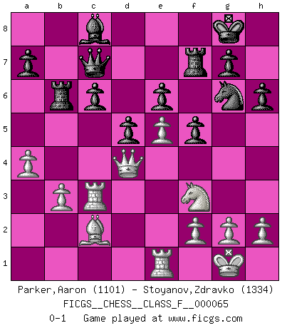 Last move : 0-1 2008 October 2 22:12:4 [Event "FICGS__CHESS__CLASS_F__000065"] [Site "FICGS"] [Date "2008.09.25"] [Round "1"] [White "Parker,Aaron"] [Black "Stoyanov,Zdravko"] [Result "0-1"] [WhiteElo "1101"] [BlackElo "1334"] 1.e4 c6 2.d4 e6 3.a3 Nf6 4.Nc3 d5 5.Bg5 Be7 6.e5 Nfd7 7.Be3 h6 8.Bd3 O-O 9.Nf3 f5 10.O-O Rf7 11.Na4 Qa5 12.b3 b5 13.Nc5 Nxc5 14.dxc5 b4 15.a4 Bxc5 16.Bxc5 Qxc5 17.Qe2 Nd7 18.Rac1 Nf8 19.Qd2 Ng6 20.c3 bxc3 21.Rxc3 Qb6 22.Bc2 Qc7 23.Re1 Rb8 24.Qd4 Rb6 0-1 Caro-Kann defense Kingside Castling by player Black (move 8) Kingside Castling by player White (move 10) Player Black won this chess game. Follow this game move after move (download)Could we look into the head of a Chess player, we should see there a whole world of feelings, images, ideas, emotion and passion. (Alfred Binet) Matt entspricht nicht immer den Tatsachen. (Savielly Grigorievitsch Tartakower) ¡Examina movidas que hagan daño! Un buen ojo for movidas desvastantes es mucho mas importante que el conocimiento de principios estratégicos. (Purdy) Si rien de grave n'est détecté lors de l'analyse d'une position, on joue alors le coup. Seconde règle de Blumenfeld. The only sure thing about luck is that it will change. (Wilson Mizner)