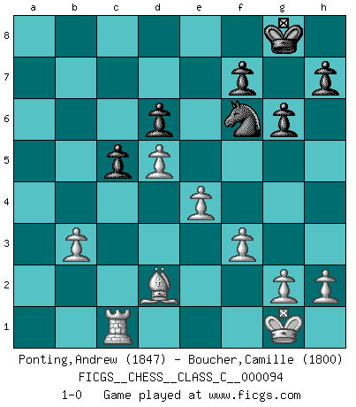 Last move : 1-0 2008 December 13 15:5:43 [Event "FICGS__CHESS__CLASS_C__000094"] [Site "FICGS"] [Date "2008.09.28"] [Round "1"] [White "Ponting,Andrew"] [Black "Boucher,Camille"] [Result "1-0"] [WhiteElo "1847"] [BlackElo "1800"] 1.d4 Nf6 2.c4 c5 3.d5 b5 4.cxb5 a6 5.f3 d6 6.e4 Nbd7 7.Nc3 g6 8.Nh3 Bg7 9.bxa6 Bxa6 10.Bxa6 Rxa6 11.O-O O-O 12.Qe2 Qb6 13.Be3 Rb8 14.Nf2 Qxb2 15.Qxa6 Qxc3 16.Rfe1 Ne5 17.Qa7 Qb2 18.Qxe7 Nc4 19.Bg5 Nh5 20.Ng4 Qb7 21.Nh6+ Bxh6 22.Qxb7 Rxb7 23.Bxh6 Na3 24.Rac1 Nf6 25.Re3 Nb1 26.Rb3 Rxb3 27.axb3 Nd2 28.Bxd2 1-0 Benko gambit half accepted Kingside Castling by player White (move 11) Kingside Castling by player Black (move 11) Player White won this chess game. Follow this game move after move (download)No Chess Grandmaster is normal; they only differ in the extent of their madness. (Viktor Korchnoi) Ein Gewinn durch eine ungenaue Kombination, sei sie auch noch so vorzeigbar, erfüllt mich mit Schaudern. (Wilhelm Steinitz) El ganar no lo es todo... pero el perder es nada. (Mednis) Je menace de comprendre la position. (Anonyme) I can't decide which is riskier; taking crazy risks, or taking advice on crazy risks from a crazy risk taker. (Gregory House in House M.D.)