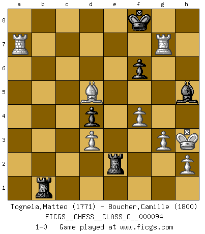 Last move : 1-0 2008 September 29 16:37:26 [Event "FICGS__CHESS__CLASS_C__000094"] [Site "FICGS"] [Date "2008.09.28"] [Round "1"] [White "Tognela,Matteo"] [Black "Boucher,Camille"] [Result "1-0"] [WhiteElo "1771"] [BlackElo "1800"] 1.Nf3 d5 2.g3 c5 3.Bg2 Nc6 4.O-O e5 5.d3 f6 6.c4 Nge7 7.Nc3 Be6 8.Qb3 Qd7 9.cxd5 Nxd5 10.Nxd5 Bxd5 11.Nxe5 Bxb3 12.Nxd7 Bxa2 13.Nxf8 Bf7 14.Nxh7 Rxh7 15.Be3 Rh5 16.Rfc1 Nd4 17.Bxd4 cxd4 18.Bxb7 Rb8 19.Rxa7 Re5 20.Rc7 Kf8 21.f4 Re3 22.Be4 Bh5 23.Bd5 Rxb2 24.Rxg7 Rb1+ 25.Kg2 Rxe2+ 26.Kh3 1-0 Reti : King's Indian attack Kingside Castling by player White (move 4) Player White won this chess game. Follow this game move after move (download)If your opponent cannot do anything active, then don't rush the position; instead you should let him sit there, suffer, and beg you for a draw. (Jeremy Silman) Er war ein guter Schachspieler, aber ich kann Leute nicht ausstehen, die 'Heil Hitler' rufen (Über Alexander Aljechin). (Miguel Najdorf) No soy una persona materialista y por eso, no resiento la falta o pérdida del dinero. La ausencia de cosas mundanas carece de importancia. Ya que el Ajedrez es una forma en la que puedo ser tan materialista como yo desee sin tener la necesidad de vender mi alma. (Jamie Walter Adams) La guerre est enfant de la passion, la passion est enfant du narcissisme et le narcissisme est l'enfant. (...) Une autre partie ? (Thibault de Vassal) Lottery : A tax on people who are bad at math. (Author unknown)