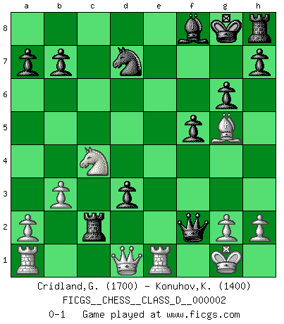 Last move : 0-1 2006 May 24 15:30:50 [Event "FICGS__CHESS__CLASS_D__000002"] [Site "FICGS"] [Date "2006.04.15"] [Round "1"] [White "Cridland,Graham"] [Black "Konuhov,Konstantin"] [Result "0-1"] [WhiteElo "1700"] [BlackElo "1400"] 1.e4 c5 2.Nf3 e6 3.d4 d5 4.exd5 exd5 5.Bb5+ Bd7 6.Bxd7+ Nxd7 7.O-O Be7 8.Re1 Ngf6 9.Qe2 Rc8 10.Nc3 cxd4 11.Nxd4 Kf8 12.Bg5 Bb4 13.Bd2 Bc5 14.Nf5 g6 15.Bh6+ Kg8 16.Ng3 d4 17.Nce4 Nxe4 18.Nxe4 Bf8 19.Bg5 Qb6 20.b3 f5 21.Nd2 Rxc2 22.Qd1 d3 23.Nc4 Qxf2+ 0-1 Sicilian : Marshall variation Kingside Castling by player White (move 7) Player Black won this chess game. Follow this game move after move (download)Bobby just drops the pieces and they fall on the right squares. (Miguel Najdorf) Früher wurde jeder komplizierte Zug, jedes interessante Opfer mit großem Beifall und Enthusiasmus aufgenommen. Heute schaltet man einfach seinen Fritz an, und man kann sehen, was los ist, ob der Zug geht oder nicht. (Vladimir Kramnik) Bobby Fischer es el mas grande genio de Ajedrez de todos los tiempos. (Alexander Kotov) Les Echecs mettent en conflit, non pas deux intelligences, mais deux volontés. (Lasker) Memory is a complicated thing, a relative to truth, but not its twin. (Barbara Kingsolver, Animal Dreams)