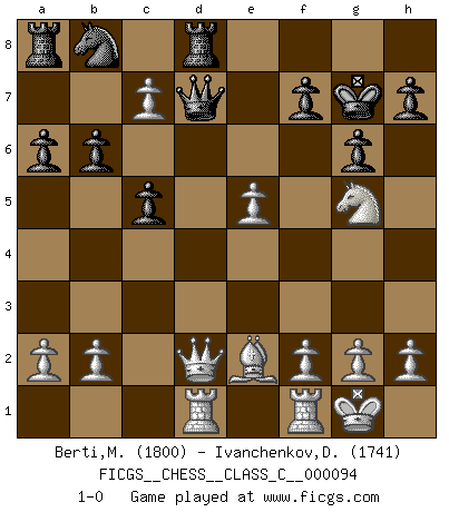 Last move : 1-0 2009 April 5 22:20:40 [Event "FICGS__CHESS__CLASS_C__000094"] [Site "FICGS"] [Date "2008.09.28"] [Round "1"] [White "Berti,Massimiliano"] [Black "Ivanchenkov,Denis"] [Result "1-0"] [WhiteElo "1800"] [BlackElo "1741"] 1.d4 Nf6 2.c4 g6 3.Nc3 Bg7 4.e4 d6 5.Nf3 O-O 6.Be2 c5 7.d5 Re8 8.Bf4 a6 9.O-O e6 10.dxe6 Bxe6 11.Bxd6 Bf8 12.Bxf8 Rxf8 13.Qc1 Kg7 14.Qe3 b6 15.Rad1 Qc7 16.Nd5 Bxd5 17.cxd5 Rd8 18.d6 Qc6 19.e5 Nd5 20.Qd2 Nc7 21.Ng5 Qd7 22.dxc7 1-0 King's Indian : 6.Be2 Kingside Castling by player Black (move 5) Kingside Castling by player White (move 9) Player White won this chess game. Follow this game move after move (download)Chess is like life. (Boris Spassky) Karpov ist ein Museumsstück. (Garry Kasparov) La estratégia requiere pensar, la táctica requiere observación. (Max Euwe) Les échecs, c'est l'art d'analyser. (Mikhail Botvinnik) As a goal marker shodan is important. As a destination it is a poor place to stop. (Thomas Tamayo)