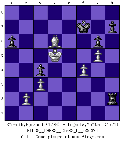 Last move : 0-1 2008 October 11 16:16:5 [Event "FICGS__CHESS__CLASS_C__000094"] [Site "FICGS"] [Date "2008.09.28"] [Round "1"] [White "Sternik,Ryszard"] [Black "Tognela,Matteo"] [Result "0-1"] [WhiteElo "1778"] [BlackElo "1771"] 1.e4 d6 2.d4 Nf6 3.Nc3 g6 4.f4 Bg7 5.Nf3 O-O 6.Bd3 Na6 7.O-O c5 8.d5 Bg4 9.Bc4 Nc7 10.h3 Bxf3 11.Qxf3 a6 12.a4 b6 13.Qd3 e6 14.dxe6 fxe6 15.Rd1 d5 16.exd5 exd5 17.Qf3 Qe7 18.Nxd5 Ncxd5 19.c3 Rad8 20.Bxd5+ Nxd5 21.Rxd5 Qe1+ 22.Kh2 c4 23.Rb1 Bf6 24.Rxd8 Rxd8 25.Qe3 Rd1 26.Qxe1 Rxe1 27.Kg3 Rf1 28.Kh2 Be7 29.g4 Bc5 30.Kg2 Re1 31.Kf3 Kf7 32.Ra1 Be3 33.Bxe3 Rxa1 34.Bxb6 Rxa4 35.Bc5 Ra1 36.Ke4 Rb1 37.Ba3 Rh1 38.g5 Rxh3 39.Kd5 Rh4 40.Bd6 Rh2 0-1 Pirc : Austrian attack, 6.Bd3 Kingside Castling by player Black (move 5) Kingside Castling by player White (move 7) Player Black won this chess game. Follow this game move after move (download)No one ever won a game by resigning. (Unknown) Der Schachmeister von Heute braucht Courage, einen Killerinstinkt, Ausdauer und Arroganz. (Larry Evans) No es tiempo de jugar al Ajedrez cuando la casa esta en llamas. (Proverbio Italiano) Les sacrifices démontrent seulement que quelqu'un a gaffé. (Savielly Tartacover) The real voyage of discovery consists not in seeking new lands but in seeing with new eyes. (Marcel Proust)