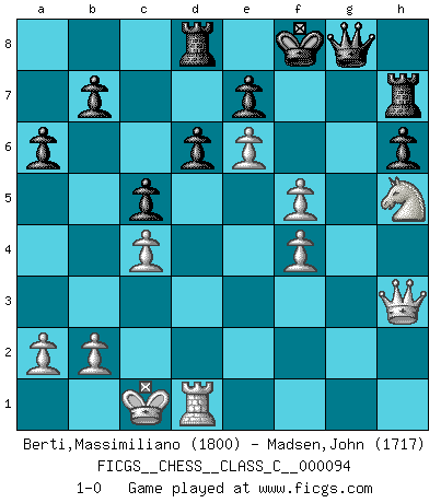 Last move : 1-0 2009 February 10 8:57:49 [Event "FICGS__CHESS__CLASS_C__000094"] [Site "FICGS"] [Date "2008.09.28"] [Round "1"] [White "Berti,Massimiliano"] [Black "Madsen,John"] [Result "1-0"] [WhiteElo "1800"] [BlackElo "1717"] 1.d4 f5 2.c4 Nf6 3.Nc3 g6 4.h4 c5 5.d5 Bg7 6.h5 Nxh5 7.e4 fxe4 8.Rxh5 gxh5 9.Qxh5+ Kf8 10.Bh6 Qb6 11.Bxg7+ Kxg7 12.Qg5+ Kf8 13.O-O-O Qg6 14.Qf4+ Qf7 15.Qh6+ Qg7 16.Qh3 Qe5 17.Qe3 d6 18.Nxe4 Bg4 19.Nf3 Bxf3 20.gxf3 Na6 21.Bh3 Nc7 22.Bd7 h6 23.f4 Qg7 24.Ng3 Rd8 25.Nh5 Qf7 26.Qh3 a6 27.Be6 Nxe6 28.dxe6 Qg8 29.f5 Rh7 30.f4 1-0 Dutch with c4 & Nc3 Queenside Castling by player White (move 13) Player White won this chess game. Follow this game move after move (download)Robert Fischer is a law unto himself. (Larry Evans) Wenn Schach ein enormer Dschungel ist, der seine Myriaden von Geheimnissen nicht preisgeben will, dann sind Computer die Kettensägen einer gewaltigen ökologisch unsensiblen Nutzholzfirma. (Nigel Short) El Ajedrez, como cualquier actividad creativa, solo puede existir a través del esfuerzo combinado de aquellos que tienen talento creativo y de aquellos que poseen la habilidad de organizar su trabajo creativo. (Mikhail Botvinnik) La victoire dans une partie d'Echecs appartient la plupart du temps à celui qui voit un peu plus loin que l'adversaire. (Lasker) Luck is what you have left over after you give 100 percent. (Langston Coleman)
