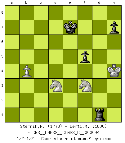 Last move : 1/2-1/2 2008 November 17 18:32:16 [Event "FICGS__CHESS__CLASS_C__000094"] [Site "FICGS"] [Date "2008.09.28"] [Round "1"] [White "Sternik,Ryszard"] [Black "Berti,Massimiliano"] [Result "1/2-1/2"] [WhiteElo "1778"] [BlackElo "1800"] 1.e4 e6 2.Qe2 c5 3.Nf3 Nc6 4.g3 g6 5.Bg2 Bg7 6.c3 Nge7 7.O-O O-O 8.d3 d6 9.Be3 b6 10.d4 d5 11.exd5 Nxd5 12.dxc5 Nxe3 13.Qxe3 Ba6 14.Re1 Ne7 15.Nd4 Nd5 16.Qe4 Re8 17.Nb3 Qc7 18.cxb6 axb6 19.N1d2 f5 20.Qh4 Bf6 21.Qh3 Bb7 22.a3 b5 23.Rad1 e5 24.Nf1 Rad8 25.Qh6 Nb6 26.Bxb7 Qxb7 27.Qe3 Nc4 28.Qe2 Qf7 29.Nc5 Bg5 30.Rxd8 Rxd8 31.b3 Nxa3 32.Qb2 b4 33.f4 exf4 34.Ne6 Qe7 35.cxb4 Nb5 36.gxf4 Nd4 37.Nxd4 Qxe1 38.Nf3 Qe4 39.Nxg5 Qxf4 40.Ne6 Qg4+ 41.Qg2 Qxg2+ 42.Kxg2 Rb8 43.Nd2 Rxb4 44.Kf2 Kf7 45.Nc5 Kf6 46.Nd3 Rb8 47.b4 g5 48.Nc4 Ke6 49.Nc5+ Ke7 50.Ne5 Ra8 51.Ncd3 Ra2+ 52.Kg3 Ra1 53.h4 gxh4+ 54.Kxh4 Rg1 55.Nf3 1/2-1/2 French : Chigorin variation Kingside Castling by player White (move 7) Kingside Castling by player Black (move 7) 10 pieces endgame at move 43 : White KNNPP , Black KRPPP WHITE : King + 2 Knights 2 Pawns BLACK : King + 1 Rook 3 Pawns 9 pieces endgame at move 53 : White KNNP , Black KRPPP WHITE : King + 2 Knights 1 Pawn BLACK : King + 1 Rook 3 Pawns 8 pieces endgame at move 54 : White KNNP , Black KRPP WHITE : King + 2 Knights 1 Pawn BLACK : King + 1 Rook 2 Pawns This chess game ended in a draw. Follow this game move after move (download)I like the moment when I break a man's ego. (Bobby Fischer) Ich habe Putins Aufstieg an die Macht beobachtet und seine Politik, die demokratischen Institutionen meines Landes zu zerstören. (Garry Kasparov) El Ajedrez es un mar en el cual un mosquito puede beber y un elefante puede bañarse. (Refrán Hindú) Je menace de comprendre la position. (Anonyme) Perhaps the current trend of many chess professionals taking up the more lucrative pastime of poker is not a wholly negative one. It may not be too late for humans to relearn how to take risks in order to innovate and thereby maintain the advanced lifestyles we enjoy. And if it takes a poker-playing supercomputer to remind us that we can't enjoy the rewards without taking the risks, so be it. (The Chess Master and the Computer, by Garry Kasparov - 2010)