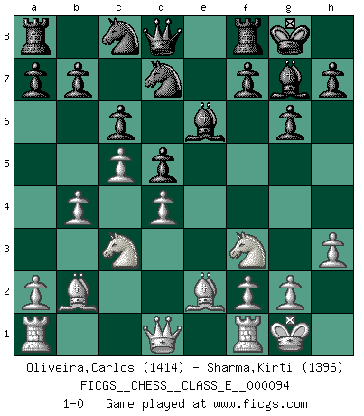 Last move : 1-0 2009 January 20 19:26:20 [Event "FICGS__CHESS__CLASS_E__000094"] [Site "FICGS"] [Date "2008.09.29"] [Round "1"] [White "Oliveira,Carlos"] [Black "Sharma,Kirti"] [Result "1-0"] [WhiteElo "1414"] [BlackElo "1396"] 1.e4 Nf6 2.e5 Nd5 3.d4 c6 4.c4 Nb6 5.Nf3 d6 6.exd6 exd6 7.h3 Be6 8.b3 g6 9.Be2 Bg7 10.Bb2 N8d7 11.O-O O-O 12.Nc3 d5 13.c5 Nc8 14.b4 1-0 This chess game has been lost on time (started : 2008.09.29 11:55:15) Alekhine's defense Kingside Castling by player White (move 11) Kingside Castling by player Black (move 11) Player White won this chess game. Follow this game move after move (download)All I want to do, ever, is just play Chess. (Bobby Fischer) Um sich vor der Gefahr einer Erkältung zu schützen, sorge der wanderlustige König beizeiten für ein brauchbares Versteck. (Aaron Nimzowitsch) El ganador de una partida es aquel jugador que hace el penúltimo error. (Savielly Tartakover) L'action d'une oeuvre littéraire se déroule sur un champ de bataille. Les masques et les types du drame moderne correspondent aux pièces du jeu d'échecs. L'intrigue correspond aux coups et aux gambits, c'est à dire aux techniques du jeu telles qu'utilisées et interprétées par les joueurs. Les tactiques et les péripéties [mouvements] correspondent aux coups exécutés par l'adversaire. (Viktor Shklovsky) The hypothalamus is one of the most important parts of the brain, involved in many kinds of motivation, among other functions. The hypothalamus controls the 'Four Fs: Fighting, Fleeing, Feeding and Mating. (Unknown author)