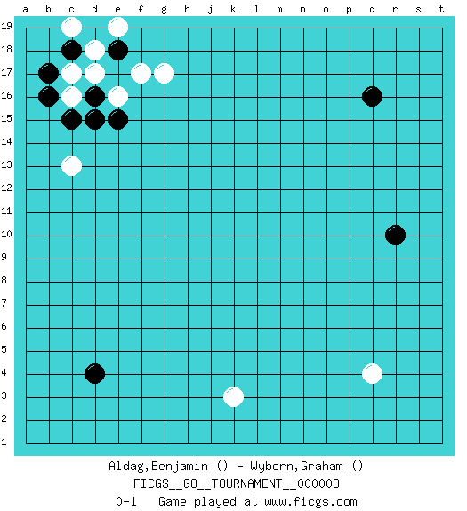 Last move : 0-1 2006 August 30 13:39:30 [Event "FICGS__GO__TOURNAMENT__000008 "] [Site "FICGS"] [Date "2006.08.12"] [Round "1"] [Black "Aldag,Benjamin "] [White "Wyborn,Graham "] [Result "0-1"] 1.q16 c17 2.d4 q4 3.r10 k3 4.d16 c16 5.d15 d17 6.c15 e16 7.b16 g17 8.c18 c13 9.b17 d18 10.e15 f17 11.d19 e19 12.e18 c19 0-1 Here are the names of the openings (joseki) played in the four corners : Corner d16 : c17 d16San-San (Sam-Sam, San-San) 3-3 Point. The San-San (3-3) point, emphasizing territory at the expense of influence.Kata-tsuki (shoulder hit). The shoulder-hit is the traditional answer to the 3-3. The direction of White 3 depends on the positions on the side. Crawling once may be the premise for a follow-up move of sliding with a knight's move in the opposite direction. If White plays 3 at 3-4 (to the right), the follow-on knight's move is then played at the top (e.g. 3-4, 4-5, 5-2). White's knight's move reduces territory potential on the side it is played. Player White won this Go (weiqi, baduk) game.Follow this game move after move (download ) Error is one of the sources of transformation. (Pierre Audouard) The ego is not master in its own house. (Sigmund Freud)