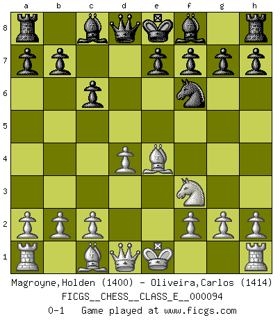 Last move : 0-1 2008 November 25 9:57:13 [Event "FICGS__CHESS__CLASS_E__000094"] [Site "FICGS"] [Date "2008.09.29"] [Round "1"] [White "Magroyne,Holden"] [Black "Oliveira,Carlos"] [Result "0-1"] [WhiteElo "1400"] [BlackElo "1414"] 1.e4 c6 2.d4 d5 3.Nc3 dxe4 4.Nxe4 Nd7 5.Nf3 Ngf6 6.Bd3 Nxe4 7.Bxe4 Nf6 0-1 This chess game has been lost on time (started : 2008.09.29 11:55:15) Caro-Kann : Steinitz variation Player Black won this chess game. Follow this game move after move (download)A man that will take back a move at Chess will pick a pocket. (Richard Fenton) Als ich elf wurde, wurde ich einfach gut. (Robert James Fischer) La última cosa en que Fischer estaba interesado era en tonterías, siempre y cuando el Ajedrez estuviera involucrado. (Elie Agur) Echiquier : carré parfait, comme la Jérusalem nouvelle décrite par l'auteur de l'Apocalypse, huit cases sur huit, exaltation du chiffre 4, symbole du cosmos aux quatre horizons... où le noir et le blanc, l'ombre et la lumière, le mal et le bien s'entremêlent et se conjuguent. (Robert Couffignal, Le Gambit du poète) Inventor: A person who makes an ingenious arrangement of wheels, levers and springs, and believes it civilization. (Ambrose Bierce, The Devil's Dictionary)