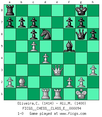 Last move : 1-0 2009 January 27 19:55:51 [Event "FICGS__CHESS__CLASS_E__000094"] [Site "FICGS"] [Date "2008.09.29"] [Round "1"] [White "Oliveira,Carlos"] [Black "Ali,Mohammad Wasif"] [Result "1-0"] [WhiteElo "1414"] [BlackElo "1400"] 1.e4 e5 2.Nf3 Nc6 3.Bb5 Nf6 4.Bxc6 dxc6 5.O-O Bd6 6.d4 Qe7 7.h3 O-O 8.Nc3 Rd8 9.Qe2 exd4 10.Nxd4 Be5 11.Nf3 Bxc3 12.bxc3 Nxe4 13.Re1 Bf5 14.Nd4 Rxd4 15.cxd4 Qf6 16.Bb2 h6 17.c4 Qg5 18.Qe3 Qg6 19.Rad1 Nd6 20.c5 1-0 This chess game has been lost on time (started : 2008.09.29 11:55:15) Ruy Lopez : Berlin defense Kingside Castling by player White (move 5) Kingside Castling by player Black (move 7) Player White won this chess game. Follow this game move after move (download)Look at Garry Kasparov. After he loses, invariably he wins the next game. He just kills the next guy. That's something that we have to learn to be able to do. (Maurice Ashley) Im Wettkampf zwischen starken Meistern kommen Fehler sehr selten vor, deshalb ist es mit bloßem Warten nicht getan. (José Raúl Capablanca) No es suficiente ser un buen jugador, se debe también de jugar bién. (Siegbert Tarrasch) Demandez au pauvre Cg1 ce qu'il en pense. Eduard Gufeld à propos de la variante Saemisch de l'Est-Indienne. Every now and then a man's mind is stretched by a new idea and never shrinks back to its former dimensions. (Oliver Wendell Holmes, Sr.)