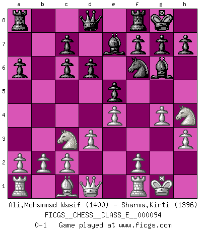 Last move : 0-1 2009 March 17 23:10:13 [Event "FICGS__CHESS__CLASS_E__000094"] [Site "FICGS"] [Date "2008.09.29"] [Round "1"] [White "Ali,Mohammad Wasif"] [Black "Sharma,Kirti"] [Result "0-1"] [WhiteElo "1400"] [BlackElo "1396"] 1.e4 Nf6 2.Nc3 e5 3.Nf3 Nc6 4.Bb5 d6 5.O-O a6 6.Ba4 Bg4 7.h3 Bh5 8.Bxc6+ bxc6 9.g4 Bg6 10.d3 Be7 11.Nh4 O-O 0-1 This chess game has been lost on time (started : 2008.09.29 11:55:15) Alekhine's defense Kingside Castling by player White (move 5) Kingside Castling by player Black (move 11) Player Black won this chess game. Follow this game move after move (download)Chess is above all, a fight ! (Emanuel Lasker) Es war undenkbar für die Behörden, dass ein sowjetischer Großmeister auf diese Art und Weise [Fischer-Taimanov 6:0] verliert, ohne dass es eine politischer Erklärung dafür gäbe. (Mark Taimanov) Yo considero que Fischer es uno de los expertos mas grandes de aperturas de siempre. (Keith Hayward) Lorsque vous vous retrouvez devant une position atroce, ne tendez pas un ultime piège dérisoire avec l'intention d'abandonner si l'adversaire le déjoue ! Faites-vous plutôt un devoir de résister comme si votre vie en dépendait. Jouez le coup qui vous déplairait au centuple si vous étiez dans la peau de votre tortionnaire ! You must have a dream in order to have it come true. (A.P.J. Kalam)
