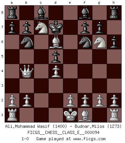 Last move : 1-0 2008 December 14 12:38:37 [Event "FICGS__CHESS__CLASS_E__000094"] [Site "FICGS"] [Date "2008.09.29"] [Round "1"] [White "Ali,Mohammad Wasif"] [Black "Budnar,Milos"] [Result "1-0"] [WhiteElo "1400"] [BlackElo "1273"] 1.c4 c6 2.Nc3 Nf6 3.d4 d5 4.Nf3 h6 5.Bf4 Nbd7 6.cxd5 cxd5 7.Qa4 e6 8.Nb5 e5 9.Nxe5 Nb6 10.Nc7+ Ke7 11.Qb4+ Qd6 12.Ng6+ Kd7 13.Bxd6 1-0 English : Caro-Kann defensive system Player White won this chess game. Follow this game move after move (download)It is always better to sacrifice your opponent's men. (Savielly Tartakower) Ich war zu klein für die Schach-Schülermannschaft! (Woody Allen) El Ajedrez es el juego mas altamente simbólico, pero las agresiones estan por lo tanto aún mas francamente representadas en la partida. Tal vez comenzo como un juego de guerra; Algo como la representación de una batalla en miniatura entre las fuerzas de dos reinos. (Karl Meninger) Vous savez, camarade Pachman, je n'éprouve pas de plaisir à être ministre, je jouerais plutôt aux échecs comme vous, ou alors ferais une révolution au Venezuela. (Che Guevara à Ludek Pachman, 'Checkmate in Prague', 1975) I'm extremely disappointed. I send you out for exciting, new designer drugs, you come back with tomato sauce. (Gregory House, House M.D.)