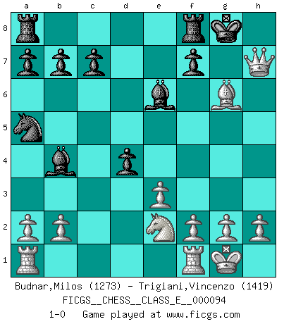 Last move : 1-0 2008 November 10 15:2:47 [Event "FICGS__CHESS__CLASS_E__000094"] [Site "FICGS"] [Date "2008.09.29"] [Round "1"] [White "Budnar,Milos"] [Black "Trigiani,Vincenzo"] [Result "1-0"] [WhiteElo "1273"] [BlackElo "1419"] 1.d4 d5 2.c4 Nf6 3.Nc3 e6 4.Bg5 dxc4 5.e3 Nc6 6.Bxc4 Be7 7.Qf3 Bb4 8.Nge2 O-O 9.O-O h6 10.Bxf6 gxf6 11.Qg3+ Kh8 12.Qh4 e5 13.Nd5 Na5 14.Qxh6+ Kg8 15.Nxf6+ Qxf6 16.Qxf6 exd4 17.Qg5+ Kh8 18.Bd3 Be6 19.Qh6+ Kg8 20.Bh7+ Kh8 21.Bg6+ Kg8 22.Qh7+ 1-0 QGD : Marshall defense Kingside Castling by player Black (move 8) Kingside Castling by player White (move 9) Player White won this chess game. Follow this game move after move (download)In order to improve your game, you must study the endgame before everything else, for whereas the endings can be studied and mastered by themselves, the middle game and the opening must be studied in relation to the endgame. (Jose Raul Capablanca) Zeige mir drei Eröffnungsvarianten und ich beweise dir, dass zwei davon inkorrekt sind. (Emanuel Lasker) Aunque la mayoría de la gente disfruta observar las partidas de los grandes Maestros de ataque, algunos de los jugadores mas notables en la historia han sido los jugadores silenciosos posicionales. Lentamente ellos te aplastan despojandote de tu espacio, congestionando tus piezas y dejandote virtualmente sin nada que hacer. (Yasser Seirawan) Des combinaisons [dans le jeu d'échecs] pareilles à des mélodies. Je crois entendre pour ainsi dire la musique des coups... (Vladimir Nabokov) Gambling : The sure way of getting nothing from something. (Wilson Mizner)