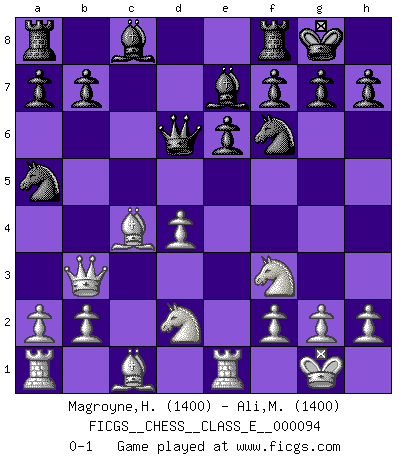 Last move : 0-1 2008 December 23 3:31:13 [Event "FICGS__CHESS__CLASS_E__000094"] [Site "FICGS"] [Date "2008.09.29"] [Round "1"] [White "Magroyne,Holden"] [Black "Ali,Mohammad Wasif"] [Result "0-1"] [WhiteElo "1400"] [BlackElo "1400"] 1.e4 c5 2.c3 Nc6 3.d4 d5 4.exd5 Qxd5 5.Nf3 Nf6 6.Nbd2 cxd4 7.Bc4 Qd6 8.Qb3 e6 9.cxd4 Be7 10.O-O O-O 11.Re1 Na5 0-1 Sicilian : Alapin's variation (2.c3) Kingside Castling by player White (move 10) Kingside Castling by player Black (move 10) Player Black won this chess game. Follow this game move after move (download)The passed pawn is a criminal, who should be kept under lock and key. Mild measures, such as police surveillance, are not sufficient. (Nimzovitch) Ich glaube, ich kenne inzwischen die Gründe für mein Versagen: schachliche Charakterfehler. Ich war nie ein Wunderkind und in meiner gesamten menschlichen Entwicklung immer zu langsam. (Viktor Kortschnoi) Si no le temes a Spassky, entonces elimino el elemento del dinero. (Jim Slater) Karpov est une pièce de musée. (Garry Kasparov) Luck is when opportunity knocks and you answer. (Anonymous)