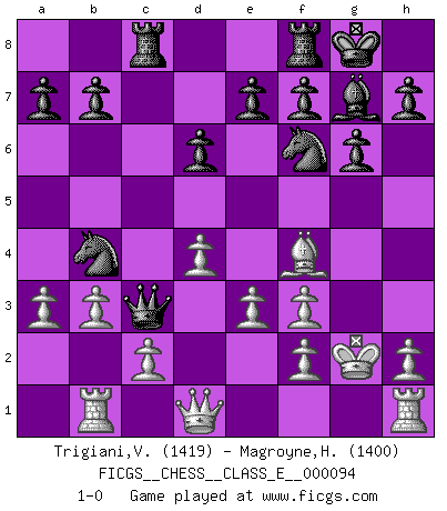 Last move : 1-0 2008 December 21 3:18:20 [Event "FICGS__CHESS__CLASS_E__000094"] [Site "FICGS"] [Date "2008.09.29"] [Round "1"] [White "Trigiani,Vincenzo"] [Black "Magroyne,Holden"] [Result "1-0"] [WhiteElo "1419"] [BlackElo "1400"] 1.d4 Nf6 2.Nc3 g6 3.Bf4 Bg7 4.Nb5 d6 5.Nxc7+ Qxc7 6.Nf3 O-O 7.e3 Bg4 8.Bc4 Qxc4 9.b3 Qc3+ 10.Kf1 Bxf3 11.gxf3 Nc6 12.Rb1 Rac8 13.Kg2 Nb4 14.a3 1-0 Queen's pawn game Kingside Castling by player Black (move 6) Player White won this chess game. Follow this game move after move (download)There are two types of sacrifices: correct ones and mine. (Mikhail Tal) Gewöhnliche Menschen denken nur daran, wie sie ihre Zeit verbringen. Ein intelligenter Mensch versucht, sie auszunutzen. (Arthur Schopenhauer) No es suficiente ser un buen jugador, se debe también de jugar bién. (Siegbert Tarrasch) Avec des compensations pour le matériel en plus... (Anonyme) The best weapon against an enemy is another enemy. (Friedrich Nietzsche)