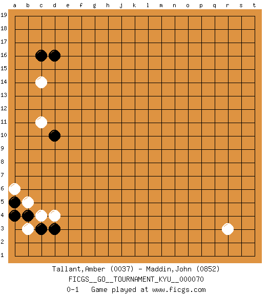 Last move : 0-1 2008 November 27 22:9:38 [Event "FICGS__GO__TOURNAMENT_KYU__000070"] [Site "FICGS"] [Date "2008.09.30"] [Round "1"] [Black "Tallant,Amber"] [White "Maddin,John"] [Result "0-1"] [Rating 1 "0037"] [Rating 2 "0852"] 1.d16 d4 2.c3 r3 3.d3 c4 4.b4 b5 5.a5 b3 6.a4 a6 7.d10 c14 8.c16 c11 0-1 This go game has been lost on time (started : 2008.09.30 22:6:30) Here are the names of the openings (joseki) played in the four corners : Corner d4 : d4 c3 Hoshi (Hwajeom, Seongjeom, Xingwei`) 4-4 Point. The star or hoshi (4-4) point, emphasizing influence at the potential expense of territory. Corner d16 : d16 c14 Hoshi (Hwajeom, Seongjeom, Xingwei`) 4-4 Point. The star or hoshi (4-4) point, emphasizing influence at the potential expense of territory. Ikken Kakari (Hankan Keolch'im, Yi Gua`jiao~, 1-Space Low Approach). White 2 is the standard approach move to the 4-4. Player White won this Go (weiqi, baduk) game. Follow this game move after move (download)At the head of two stones in a row, play hane. (Anonymous) It is not titles that honor men, but men that honor titles. (Niccolo Machiavelli)