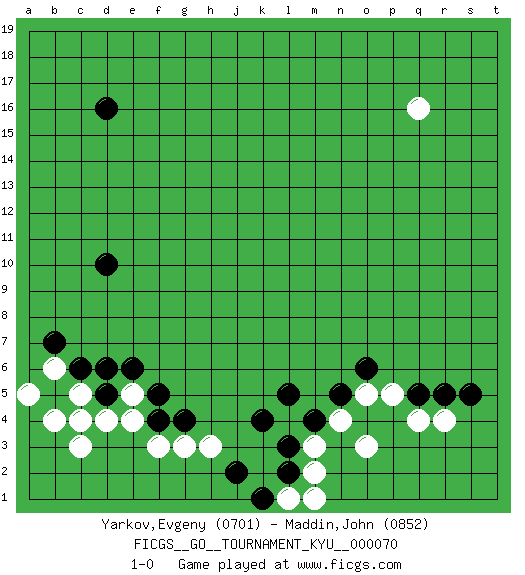 Last move : 1-0 2008 December 20 15:5:59 [Event "FICGS__GO__TOURNAMENT_KYU__000070"] [Site "FICGS"] [Date "2008.09.30"] [Round "1"] [Black "Yarkov,Evgeny"] [White "Maddin,John"] [Result "1-0"] [Rating 1 "0701"] [Rating 2 "0852"] 1.d16 q16 2.d10 d4 3.d5 c3 4.c4 b4 5.b5 c5 6.c6 c4 7.e6 e5 8.d6 b6 9.b7 a5 10.k4 n4 11.m4 m3 12.l3 m2 13.l2 l1 14.k1 m1 15.j2 g3 16.f5 e4 17.f4 f3 18.g4 h3 19.l5 o3 20.n5 o5 21.o6 p5 22.q5 q4 23.r5 r4 24.s5 1-0 This go game has been lost on time (started : 2008.09.30 22:6:30) Here are the names of the openings (joseki) played in the four corners : Corner d4 : d4 d5 Hoshi (Hwajeom, Seongjeom, Xingwei`) 4-4 Point. The star or hoshi (4-4) point, emphasizing influence at the potential expense of territory. Corner q4 : n4 m4 This joseki is unknown. A weak or weird move has probably been played in this corner. Player Black won this Go (weiqi, baduk) game. Follow this game move after move (download)The second line is the line of defeat, the third line is the line of territory, and the fourth line is the line of influence. (Anonymous) The quality of decision is like the well-timed swoop of a falcon which enables it to strike and destroy its victim. (Sun Tzu)