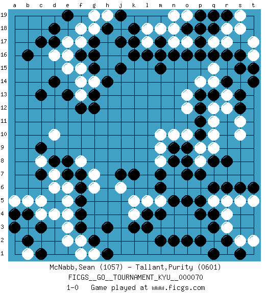 Last move : 1-0 2009 January 20 5:25:10 [Event "FICGS__GO__TOURNAMENT_KYU__000070"] [Site "FICGS"] [Date "2008.09.30"] [Round "1"] [Black "McNabb,Sean"] [White "Tallant,Purity"] [Result "1-0"] [Rating 1 "1057"] [Rating 2 "0601"] 1.r16 d4 2.q3 d16 3.p16 q10 4.r6 o4 5.f16 q17 6.q16 r17 7.p17 p18 8.o18 o17 9.q18 d10 10.k17 q19 11.p19 r18 12.r19 s19 13.q19 s18 14.s16 t16 15.t15 t17 16.s15 s10 17.k3 p6 18.f3 e3 19.f4 f2 20.g2 e2 21.h3 f1 22.b4 b3 23.c3 c4 24.b2 b1 25.c1 b5 26.a3 a5 27.a4 c5 28.q8 f17 29.g17 f18 30.o8 n18 31.o16 n17 32.n16 m16 33.m15 n19 34.m17 l17 35.l16 l18 36.k18 o19 37.p18 m18 38.m16 e5 39.m2 k5 40.m4 m5 41.n5 n6 42.o5 o6 43.p5 p8 44.p7 p9 45.o7 q5 46.q6 n4 47.p4 m3 48.l4 p3 49.q4 r5 50.m6 n7 51.o9 q9 52.r8 o10 53.n9 n10 54.m7 g1 55.h1 l5 56.k7 k4 57.l3 n3 58.n2 o3 59.p2 q2 60.r2 r3 61.q1 r4 62.o2 s2 63.s6 s5 64.s1 t2 65.t6 t5 66.p11 m10 67.p10 q11 68.p12 q12 69.p13 p14 70.q13 r13 71.r14 s14 72.s13 r12 73.s12 q14 74.t14 o13 75.c13 o12 76.b16 e16 77.g16 j16 78.h14 h15 79.g15 m8 80.n8 m9 81.c17 s11 82.d17 e17 83.d18 q15 84.e13 g18 85.h18 h17 86.j17 h16 87.j15 g14 88.k16 f14 89.g12 f15 90.g13 f13 91.f12 e15 92.d14 h19 93.j19 g19 94.e19 e4 95.f5 e6 96.d8 j6 97.j7 g6 98.f6 g7 99.f7 f8 100.e7 d7 101.c7 d6 102.e8 c8 103.c9 1-0 Here are the names of the openings (joseki) played in the four corners : Corner d16 : d16 f16 Hoshi (Hwajeom, Seongjeom, Xingwei`) 4-4 Point. The star or hoshi (4-4) point, emphasizing influence at the potential expense of territory. Ikken Takagakari (Hankan Nop'dakeolch'im, Yi Gaojia, 1-Space High Approach). White typically responds at 6-4 or 3-10. White 4-10 is played when White finds play on the right side advantageous. White 4-8 or 3-8 may be played when White has support at top. Corner d4 : d4 f3 Hoshi (Hwajeom, Seongjeom, Xingwei`) 4-4 Point. The star or hoshi (4-4) point, emphasizing influence at the potential expense of territory. Ikken Kakari (Hankan Keolch'im, Yi Gua`jiao~, 1-Space Low Approach). Black 2 is the standard approach move to the 4-4. Player Black won this Go (weiqi, baduk) game. Follow this game move after move (download)Play slow, win slow; play fast, lose fast. (Anonymous) Internal peace cannot coexist with external war. (Don Groves)