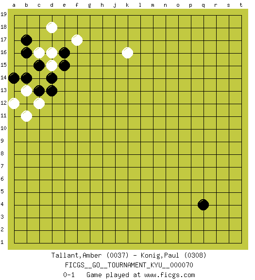 Last move : 0-1 2008 December 17 2:51:44 [Event "FICGS__GO__TOURNAMENT_KYU__000070"] [Site "FICGS"] [Date "2008.09.30"] [Round "1"] [Black "Tallant,Amber"] [White "Konig,Paul"] [Result "0-1"] [Rating 1 "0037"] [Rating 2 "0308"] 1.q4 d16 2.e15 k16 3.e16 d15 4.d14 c14 5.c13 b13 6.d13 c12 7.c15 c16 8.b14 b11 9.a14 a12 10.b16 d18 11.b17 f17 0-1 This go game has been lost on time (started : 2008.09.30 22:6:30) Here are the names of the openings (joseki) played in the four corners : Corner d16 : d16 e15 Hoshi (Hwajeom, Seongjeom, Xingwei`) 4-4 Point. The star or hoshi (4-4) point, emphasizing influence at the potential expense of territory. Player White won this Go (weiqi, baduk) game. Follow this game move after move (download)To emphasize the lack of determination in his moves, one speaks of chance. (Pierre Audouard) The worth of a book is to be measured by what you can carry away from it. (James Bryce)