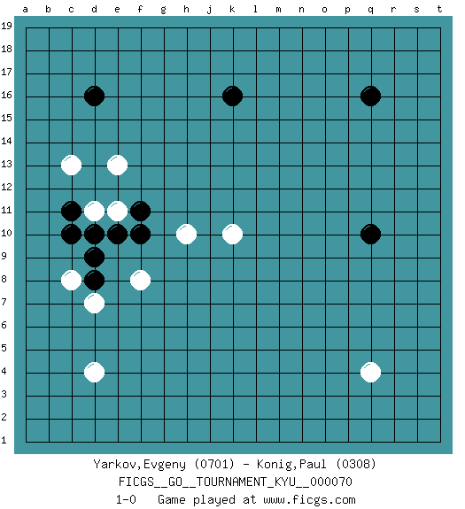 Last move : 1-0 2008 November 22 1:49:39 [Event "FICGS__GO__TOURNAMENT_KYU__000070"] [Site "FICGS"] [Date "2008.09.30"] [Round "1"] [Black "Yarkov,Evgeny"] [White "Konig,Paul"] [Result "1-0"] [Rating 1 "0701"] [Rating 2 "0308"] 1.q16 d4 2.d16 k10 3.d10 h10 4.e10 q4 5.f10 c8 6.d9 f8 7.d8 d7 8.q10 d11 9.c11 e11 10.f11 e13 11.c10 c13 12.k16 1-0 Here are the names of the openings (joseki) played in the four corners : Corner d16 : d16 d11 Hoshi (Hwajeom, Seongjeom, Xingwei`) 4-4 Point. The star or hoshi (4-4) point, emphasizing influence at the potential expense of territory. Player Black won this Go (weiqi, baduk) game. Follow this game move after move (download)Win the early ko to win the game. (Anonymous) If you know the enemy and know yourself you need not fear the results of a hundred battles. (Sun Tzu)