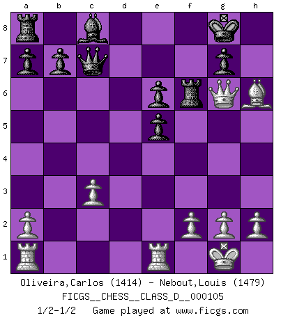 Last move : 1/2-1/2 2008 December 10 15:52:12 [Event "FICGS__CHESS__CLASS_D__000105"] [Site "FICGS"] [Date "2008.10.01"] [Round "1"] [White "Oliveira,Carlos"] [Black "Nebout,Louis"] [Result "1/2-1/2"] [WhiteElo "1414"] [BlackElo "1479"] 1.e4 c5 2.d4 cxd4 3.c3 dxc3 4.Nxc3 Nc6 5.Bc4 e6 6.Nf3 Bb4 7.O-O Bxc3 8.bxc3 Qa5 9.Qe2 Nge7 10.e5 Ng6 11.Re1 O-O 12.Bd2 Qc7 13.Bd3 Nce7 14.Ng5 d6 15.Qh5 h6 16.Nxf7 Rxf7 17.Bxg6 Nxg6 18.Qxg6 dxe5 19.Bxh6 Rf6 20.Qe8+ Rf8 21.Qg6 Rf6 22.Qe8+ Rf8 23.Qg6 Rf6 1/2-1/2 Sicilian : Smith-Morra gambit Kingside Castling by player White (move 7) Kingside Castling by player Black (move 11) This chess game ended in a draw. Follow this game move after move (download)It was clear to me that the vulnerable point of the American Grandmaster (Bobby Fischer) was in double-edged, hanging, irrational positions, where he often failed to find a win even in a won position. (Efim Geller) Je mehr ich von der FIDE weiss, um so weniger verstehe ich. (Alexander Kalifman) De eso se trata el Ajedrez. Un día le das una lección a tu oponente y al día siguiente el te da una a tí. (Bobby Fischer) Aux échecs, les retours au sommet sont rares : les dommages psychologiques consécutifs à une défaite sont trop sévères. (Daily Telegraph) Cactus - It is depressed cucumber. (Ilmars Cirulis)
