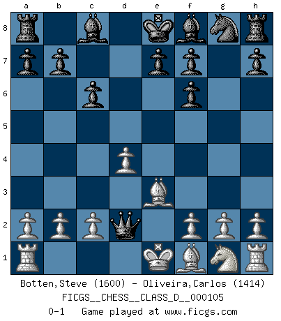 Last move : 0-1 2008 October 17 4:56:47 [Event "FICGS__CHESS__CLASS_D__000105"] [Site "FICGS"] [Date "2008.10.01"] [Round "1"] [White "Botten,Steve"] [Black "Oliveira,Carlos"] [Result "0-1"] [WhiteElo "1600"] [BlackElo "1414"] 1.e4 c6 2.d4 d5 3.Nc3 dxe4 4.Nxe4 Nd7 5.Qe2 Ndf6 6.Nxf6+ gxf6 7.Be3 Qa5+ 8.Qd2 Qxd2+ 0-1 Caro-Kann : Steinitz variation Player Black won this chess game. Follow this game move after move (download)Capture of the adverse King is the ultimate but not the first object of the game. (William Steinitz) Jede Eröffnung ist gut genug um gespielt zu werden, wenn nur ihr Ruf schlecht genug ist. (Savielly Grigorievitsch Tartakower) Peones: ellos son el alma de esta partida, solos forman el ataque y la defensa. (Philidor) Un journaliste : 'Vous préférez avoir une dame de plus sur l'échiquier ou au lit ?' Boris Spassky : 'Ca dépend de la position.' Every vice is only an exaggeration of a necessary and virtuous function. (Ralph Waldo Emerson, Journals 1936)