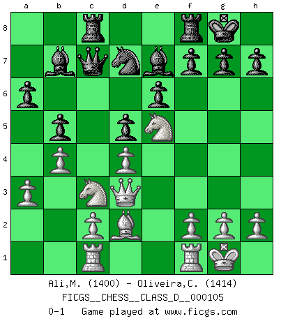 Last move : 0-1 2009 January 26 19:53:39 [Event "FICGS__CHESS__CLASS_D__000105"] [Site "FICGS"] [Date "2008.10.01"] [Round "1"] [White "Ali,Mohammad Wasif"] [Black "Oliveira,Carlos"] [Result "0-1"] [WhiteElo "1400"] [BlackElo "1414"] 1.e4 c6 2.Nc3 d5 3.exd5 cxd5 4.Nf3 Nf6 5.Bb5+ Bd7 6.O-O Nc6 7.Qe2 e6 8.d4 Be7 9.Be3 O-O 10.a3 Rc8 11.Rac1 a6 12.Bxc6 Bxc6 13.Ne5 b5 14.b4 Bb7 15.Qd3 Qc7 16.Bd2 Nd7 0-1 This chess game has been lost on time (started : 2008.10.01 17:28:33) Caro-Kann defense Kingside Castling by player White (move 6) Kingside Castling by player Black (move 9) Player Black won this chess game. Follow this game move after move (download)Chess is thirty to forty percent psychology. You don't have this when you play a computer. I can't confuse it. (Judith Polgar) Es gibt nur zwei wahre Schachgenies - das andere war Wilhelm Steinitz, der Weltmeister von 1872 bis 1894. (Robert James Fischer) Puntos débiles o agujeros en la posición de tu oponente deben de ser ocupados por piezas, no Peones. (Siegbert Tarrasch) La vie et les Echecs sont tous les deux une lutte constante. (Lasker) I think your argument is specious - I think your tie is ugly. (Gregory House to Dr. Foreman, House M.D.)