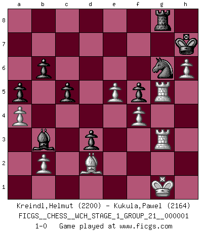Last move : 1-0 2006 September 28 19:24:33 [Event "FICGS__CHESS__WCH_STAGE_1_GROUP_21__000001"] [Site "FICGS"] [Date "2006.08.12"] [Round "1"] [White "Kreindl,Helmut"] [Black "Kukula,Pawel"] [Result "1-0"] [WhiteElo "2200"] [BlackElo "2164"] 1.Nf3 Nf6 2.d4 g6 3.g3 Bg7 4.Bg2 O-O 5.c4 d6 6.O-O Nbd7 7.Nc3 e5 8.h3 c6 9.e4 Qb6 10.c5 dxc5 11.dxe5 Ne8 12.e6 fxe6 13.Ng5 Ne5 14.f4 Nf7 15.Nxf7 Bd4+ 16.Kh2 Rxf7 17.e5 Nc7 18.Ne4 Nd5 19.a4 a5 20.Ra3 Rf8 21.h4 Qc7 22.Ng5 b6 23.Be4 Qg7 24.h5 h6 25.Nf3 gxh5 26.Nxd4 cxd4 27.Qxh5 Ra7 28.g4 Ba6 29.Rf2 d3 30.Bd2 Rd7 31.Ra1 Rdf7 32.Raf1 Ne7 33.Rg1 Kh8 34.Kh1 Kg8 35.g5 Rf5 36.Rh2 Bc4 37.Rg4 Qg6 38.Qxg6+ Nxg6 39.gxh6 Kh7 40.Kg1 c5 41.Rhg2 Rg8 42.R2g3 Bb3 43.Bxf5 exf5 44.Rg5 1-0 Comment by player 1 : Helmut Kreindl : Maybe 20...Rf8 was inaccurate - Kasparov played Qc7 against Shirov and only after Nd6 he played Rf8. Reti Opening Kingside Castling by player Black (move 4) Kingside Castling by player White (move 6) Player White won this chess game. Follow this game move after move (download)I thought the most common mistake [in chess] was the first one: Learning the game :P (Garvin Gray, FICGS forum) Es tut gut, die Entwicklungsperiode von, [...] demokratischem Geist durchdringen zu lassen. Wie undemokratisch wäre es doch beispielsweise, den einen Offizier große Spaziertouren vornehmen zu lassen, während die anderen zu Hause säßen und sich entsetzlich langweilten. (Aaron Nimzowitsch) La vida es como el Ajedrez, con lucha, competición y eventos buenos y malos. (Benjamin Franklin) On entre au jeu d'Echecs comme on entre en Religion. Pour le joueur d'Echecs, la partie d'Echecs c'est l'office, la messe, le défilé du 1er Mai, le dépôt de gerbe au Monument aux Morts. C'est un drame sacré. (Michel Roos) To err is human, to shift the blame on someone else is tactical. (Mladen Jankovic)